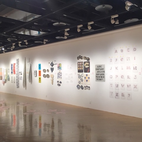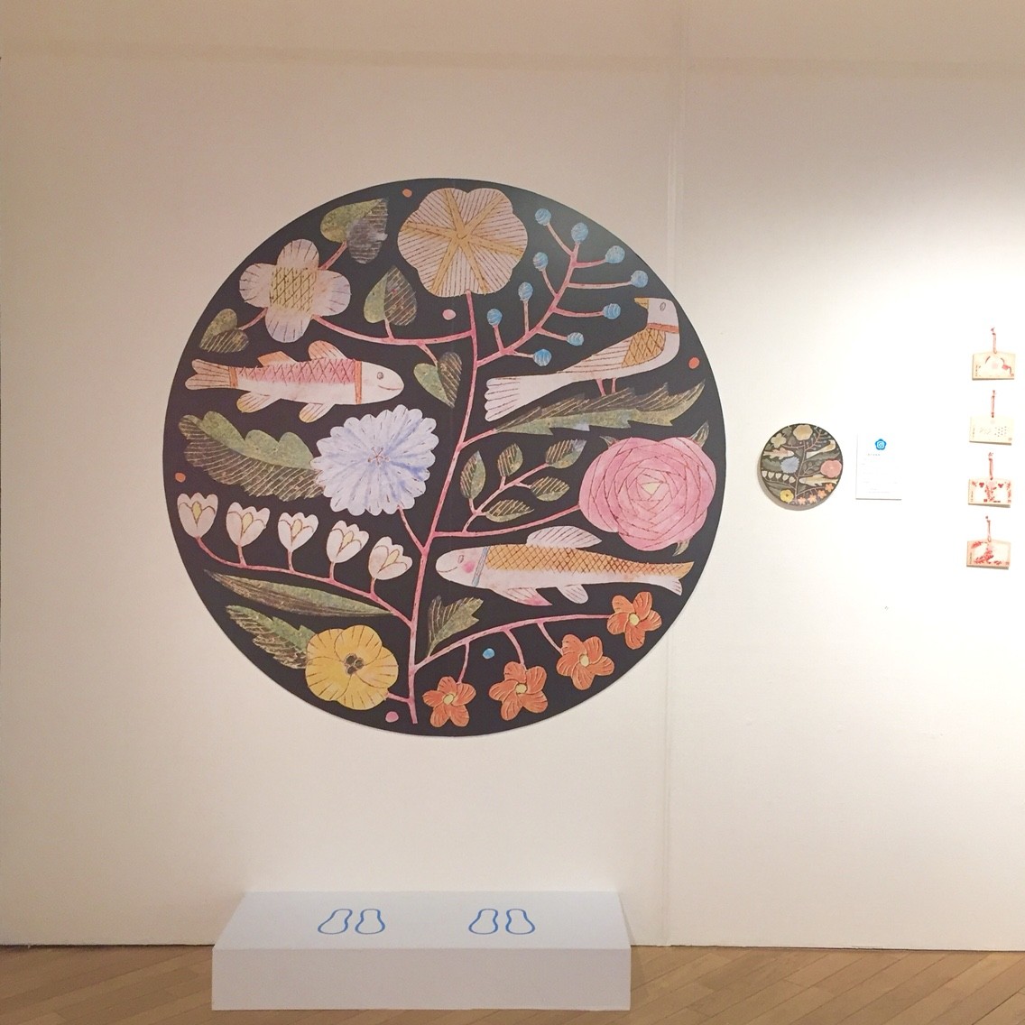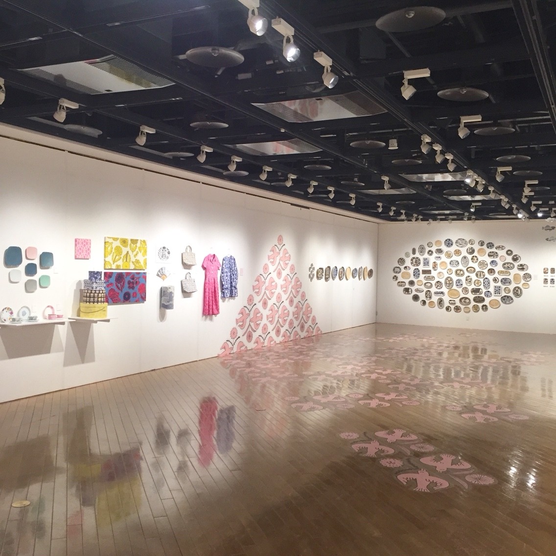 ひとつひとつ異なる図案が施されたハンドメイドの器を壁一面にずらりと並べた展示をはじめ、平面作品にフォーカスした作品、さまざまなブランドとコラボレートした作品の紹介、さらに壁画空間も登場します。