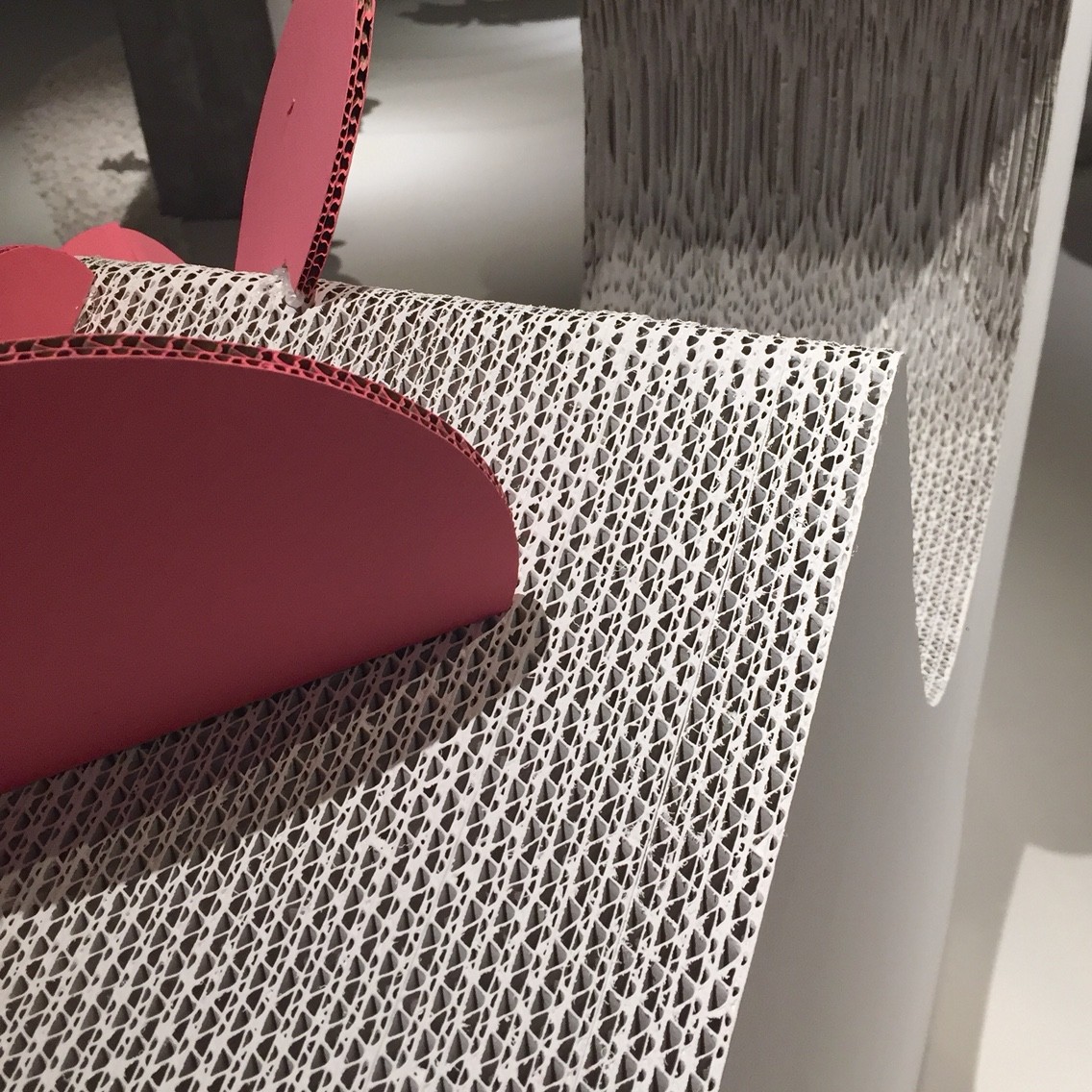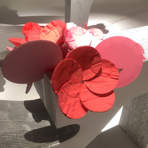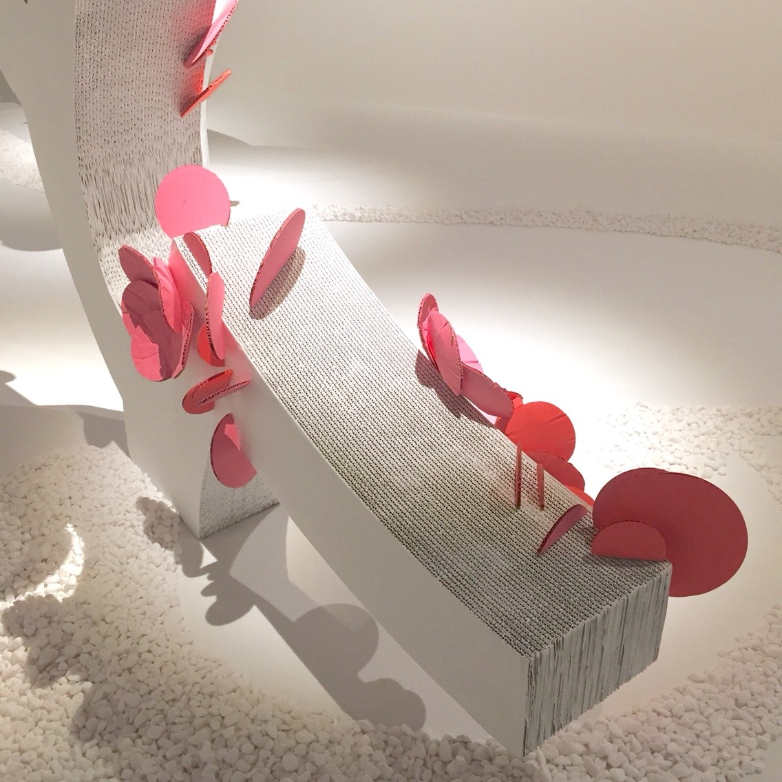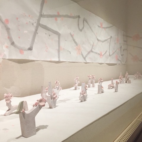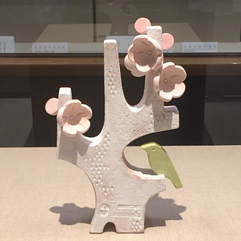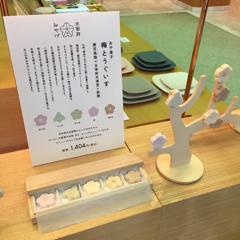 この展示会のために新たに制作した陶製の造形作品と、ダンボールを使用した、鹿児島さんならでは造形表現の「曲水の宴」が展示されています。また、鹿児島さんと太宰府天満宮と和菓子の鈴懸とのコラボ商品のお干菓子「梅とうぐいす」が販売中です。