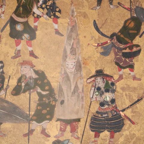 「豊国祭礼図屏風(部分)」狩野内膳筆[重要文化財](17 世紀/京都・豊国神社)。秀吉の七回忌のお祭りを描いた屏風絵の中に、タケノコのコスプレをした人がいました。