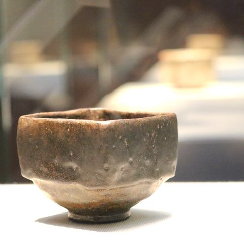 「黒楽茶碗 銘 ムキ栗」長次郎作[重要文化財](16 世紀/国・文化庁保管)。唐物を至上とする旧来の価値観に異なる美の表現に挑戦した千利休が、自分の理想の茶碗を長次郎に作らせたもの。