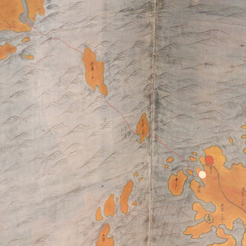 「日本図・世界図屏風(部分)」[重要文化財]6曲1双(16 世紀/福井・浄得寺)に、肥前名護屋と壱岐、対馬、韓国を結ぶ航路が記載されていました。