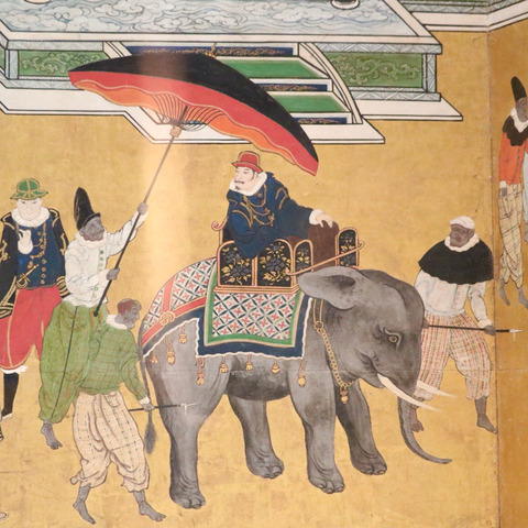 「南蛮屏風(部分)」6曲1双 狩野内膳筆(17世紀)の中に描かれている象のモデルは、マニラ総督から秀吉に送られたアジア象の「ドン・ペドロ」と思われているそうです。