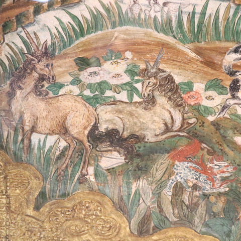「大洪水図屏風」(17世紀末~18 世紀前半/メキシコ・ソウマヤ美術館/カルロス・スリム財団)に描かれたユニコーンと麒麟。