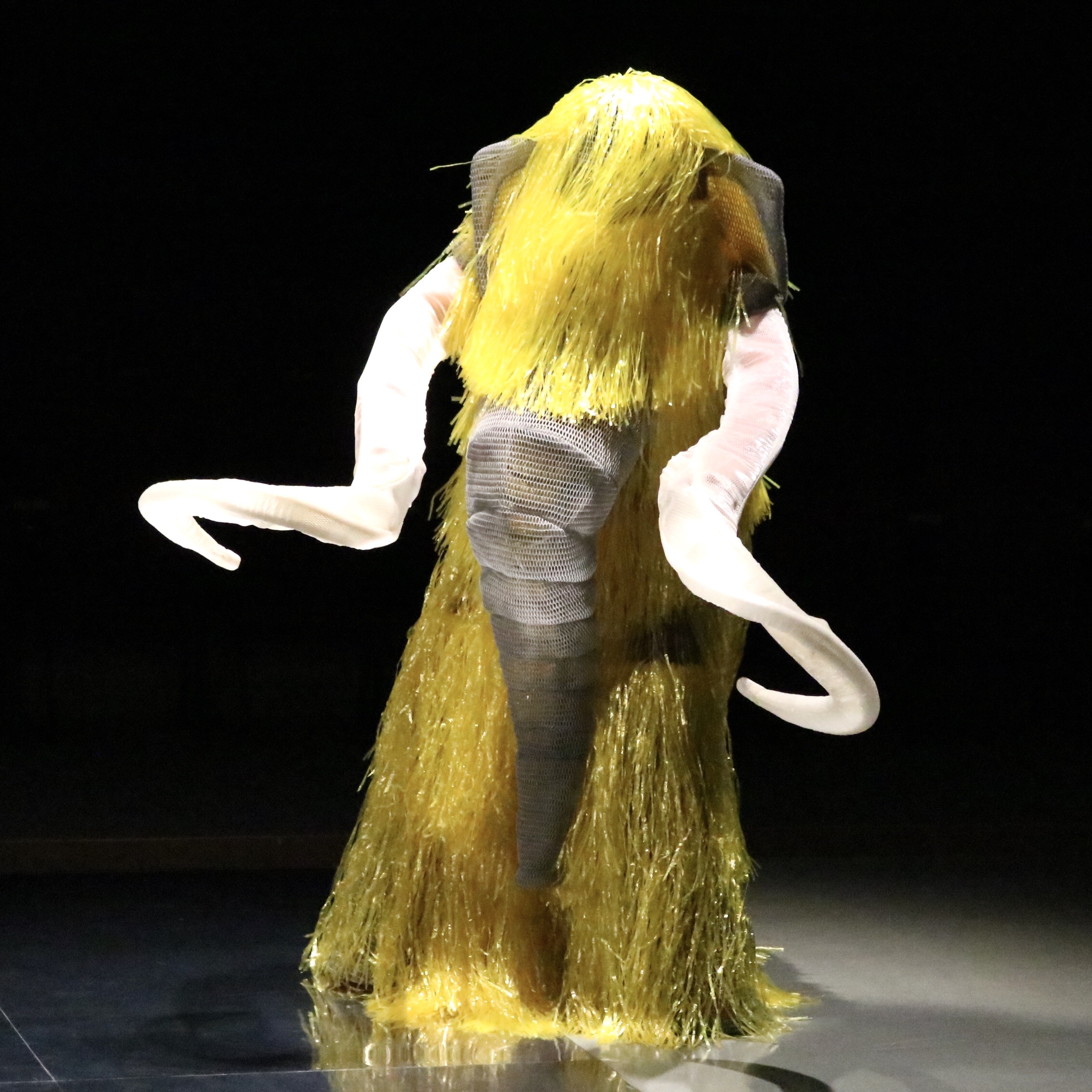 これまでに森山開次氏など国内外問わず多くの振付家や演出家の作品に出演している若手ダンスパフォーマー藤村港平氏のパフォーマンスがひびのこづえ氏の衣装に息を吹き込み、代表作《ベアリング・グロッケン II》などでも話題の川瀬浩介氏による音楽にあわせ、様々な衣装で変身しながらマンモスが踊り出します。