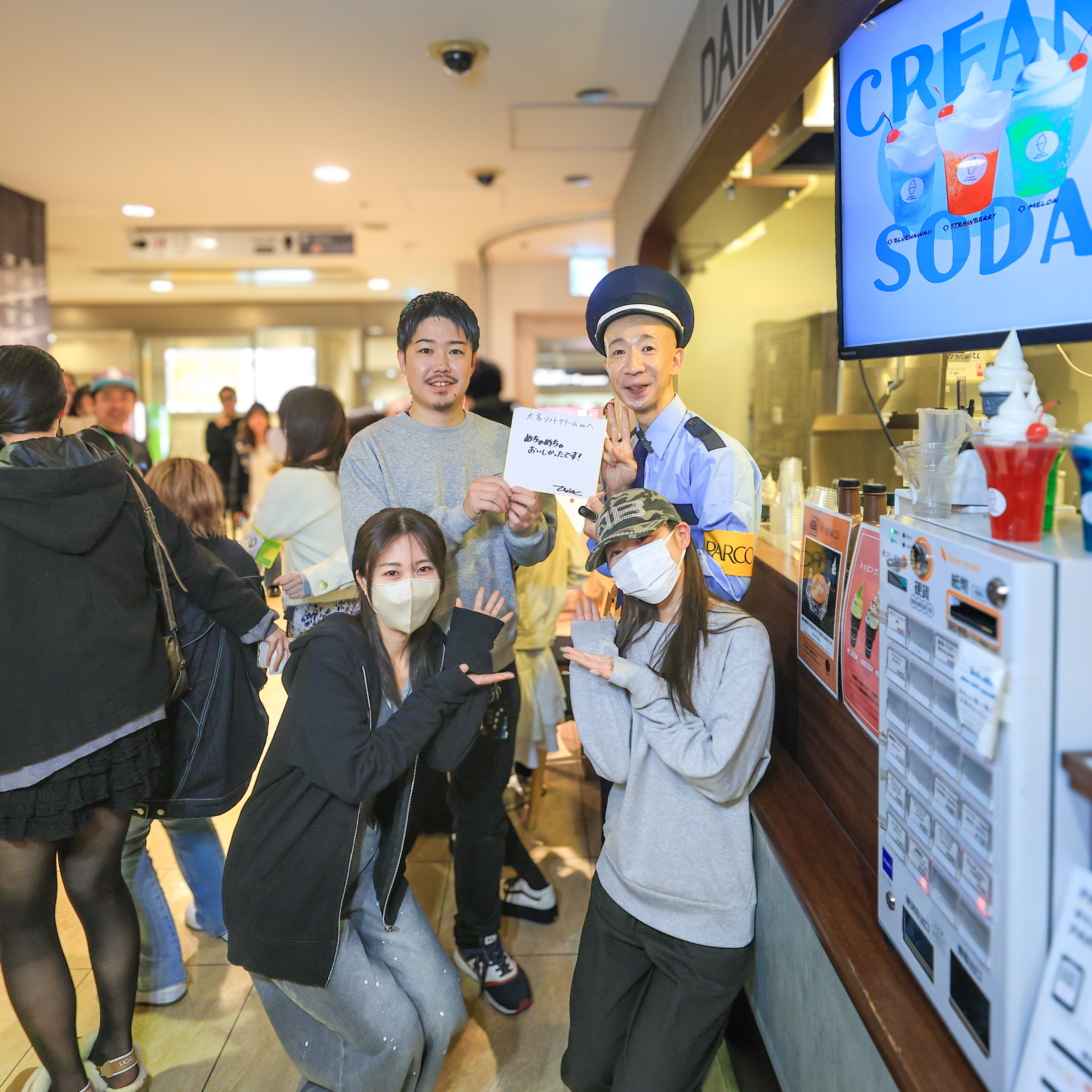 「大名ソフトクリーム 福岡PARCO店」のスタッフのみなさんと記念撮影。