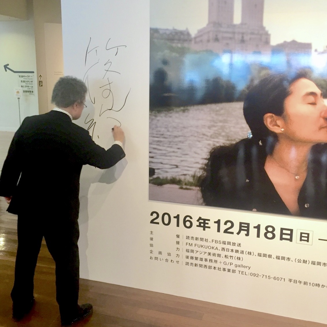 展示会会場前のジョン・レノンとオノ・ヨーコさんの写真のボードにサインをする篠山紀信さん。
