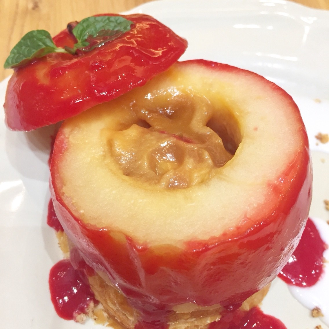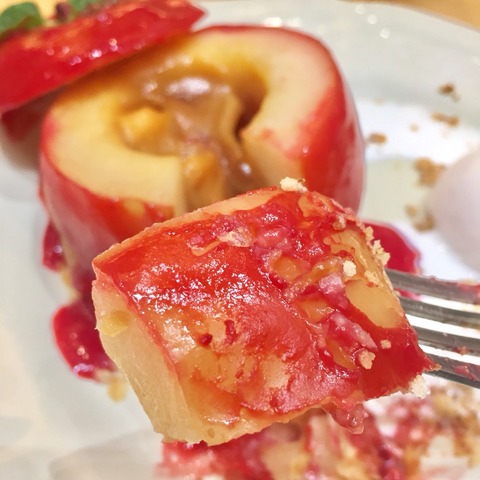 "丸ごと林檎のキャラメルアップルパイ"は林檎をまるまる1個使ったスイーツで、ローストした林檎に塩キャラメルのカスタードが詰めてあり、サクサク食感のパイといっしょにいただきます。