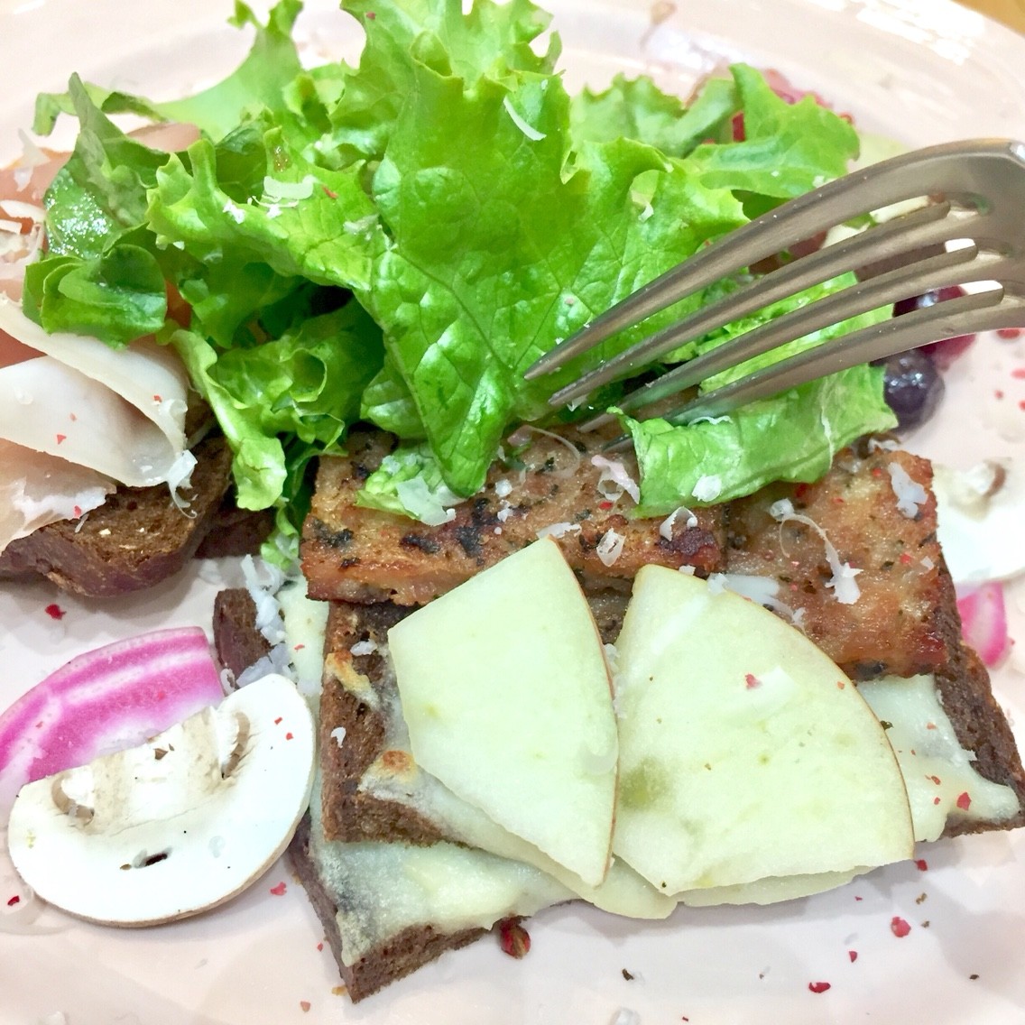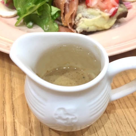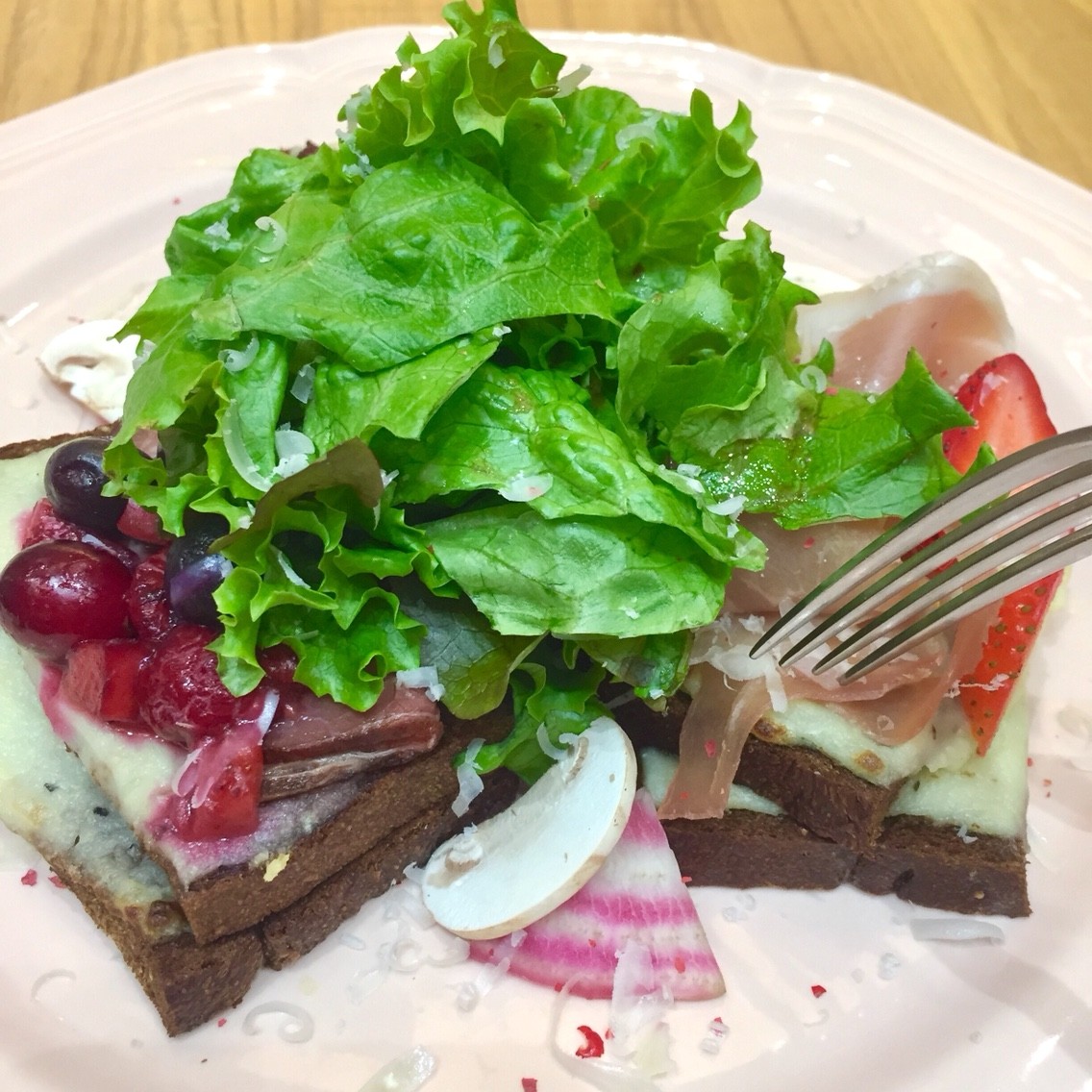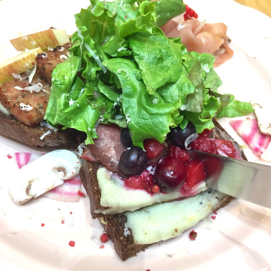 "生ハムとローストビーフのオープンサンド"は、黒い全粒粉のパンにハニーチーズマッシュポテトを塗って焼き上げていて、その上に生ハム、ローストビーフ、バジルケーゼと3種のフルーツをあわせてあります。トリュフ風味のソースをかけていただきました。