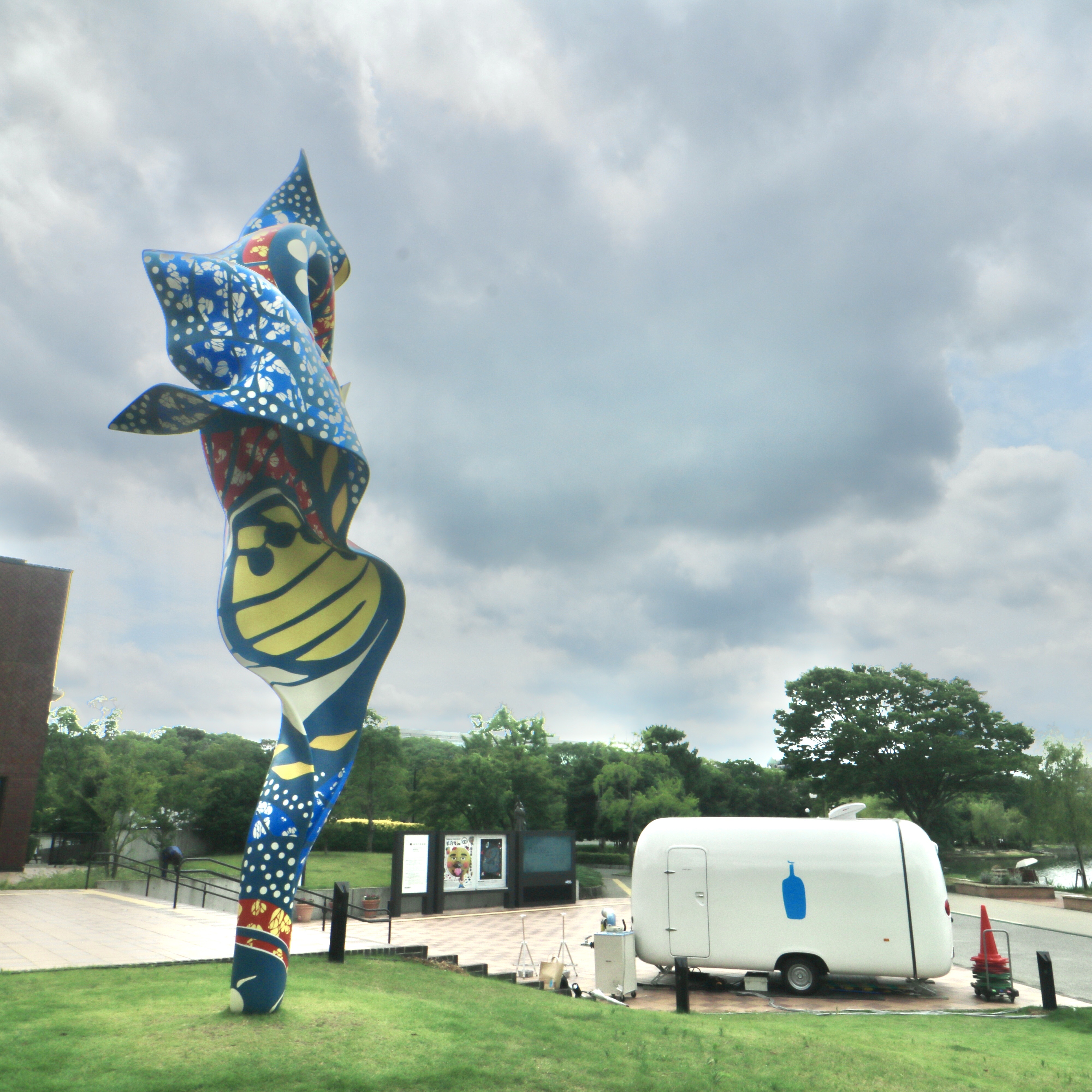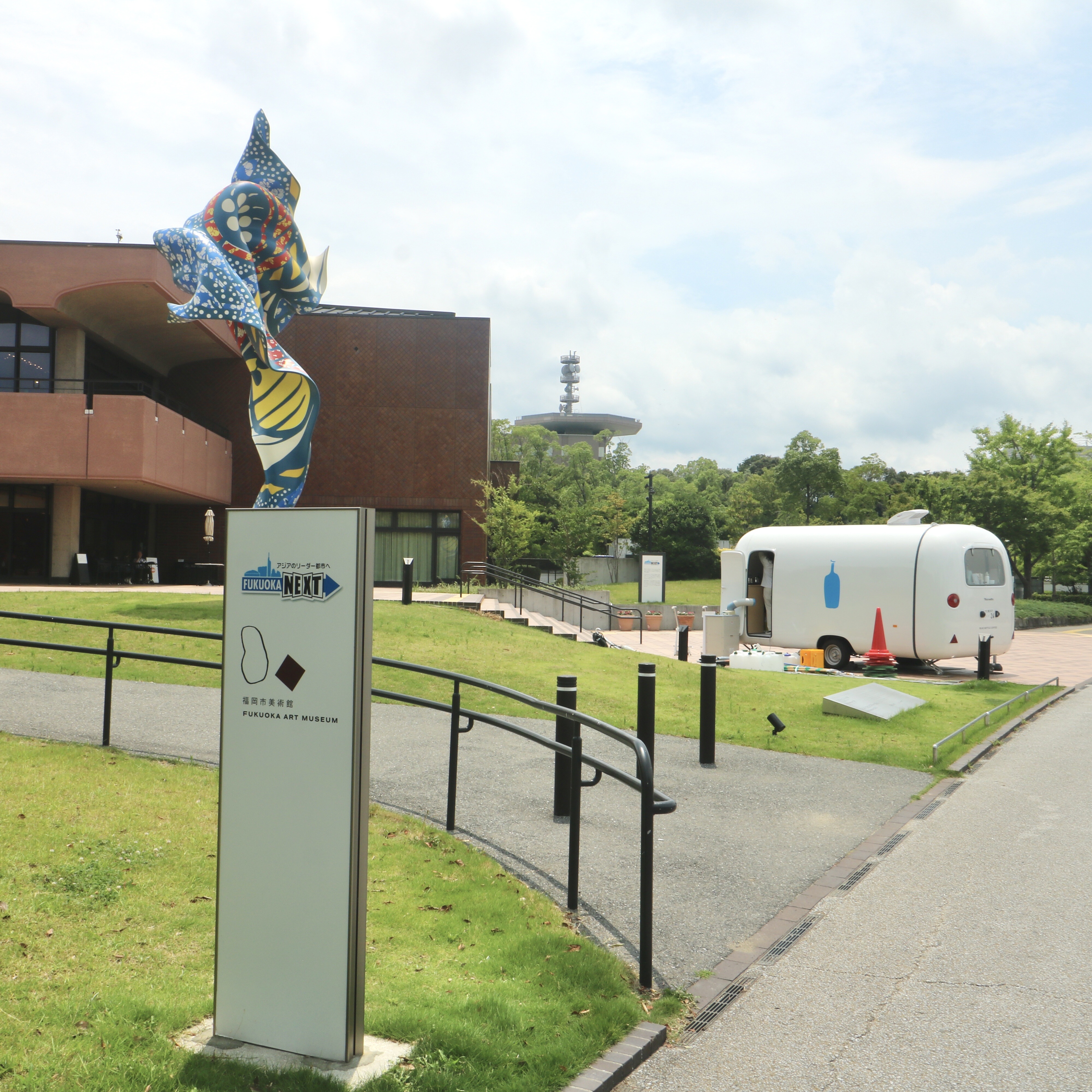 福岡市美術館のオブジェ(左)とブルーボトル コーヒートラック。