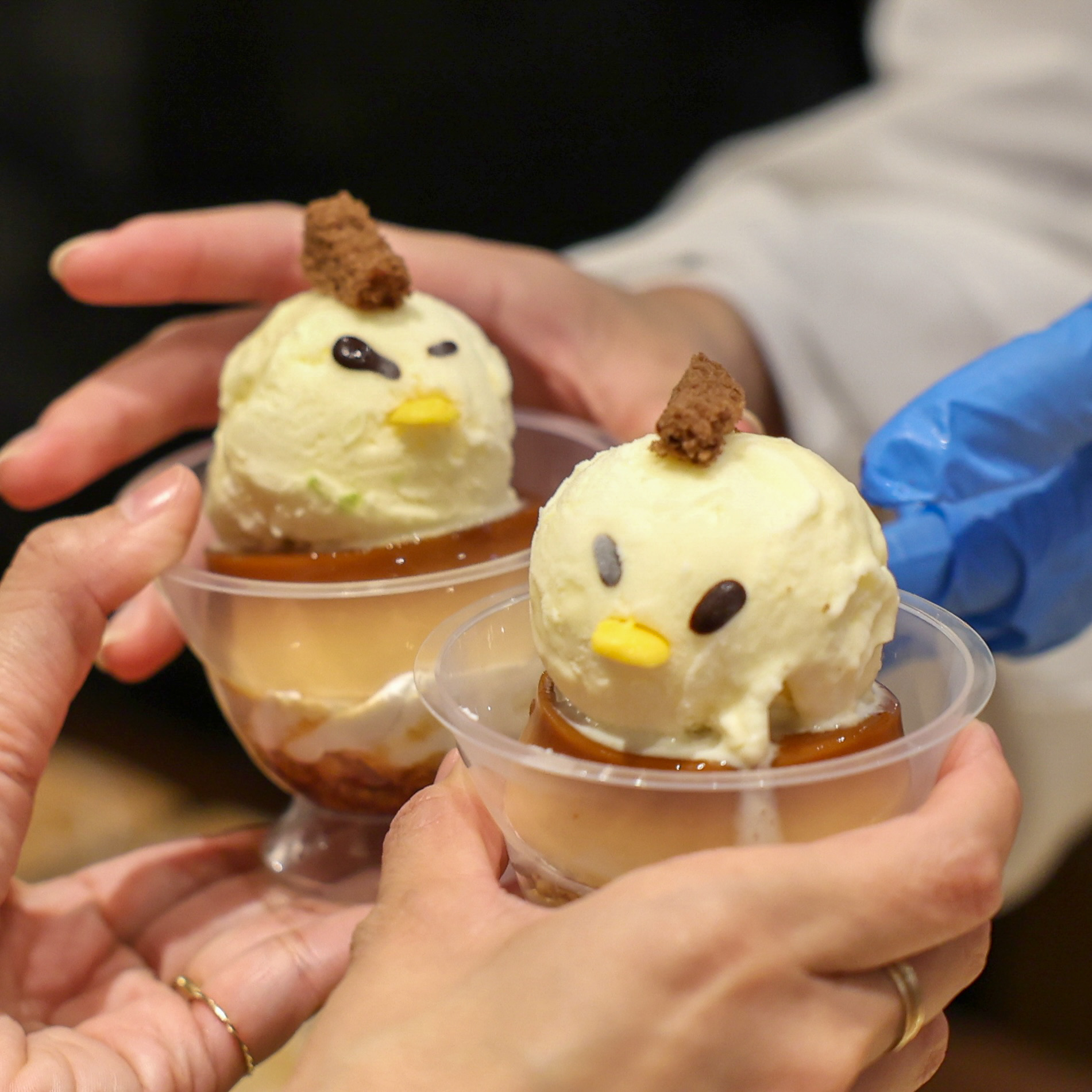 「どすこい!横綱のつっぱりプリンパフェ」の大きなバニラアイスとしっかりした食感のプリン。