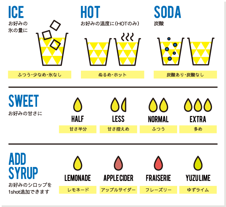 丁寧に一つずつ手作業で加工し、特別な抽出方法で非加熱でフレッシュな状態を保ったままレモネードベースを作り上げます。