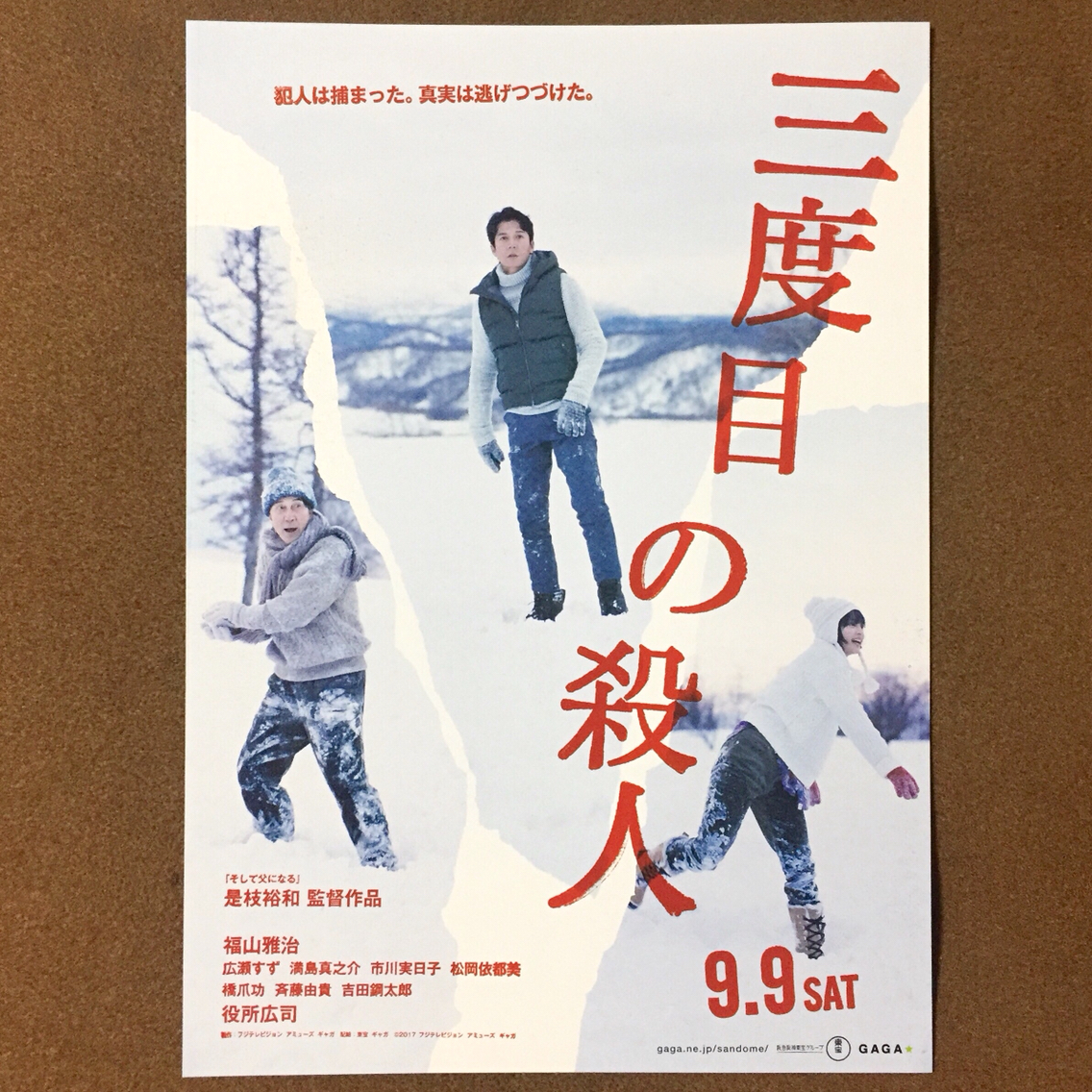 出演:福山雅治、役所広司、広瀬すず、斉藤由貴、吉田剛太郎、満島真之介、松岡依都美、市川実日子、 橋爪功