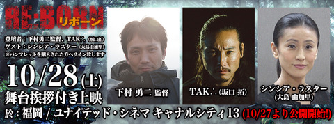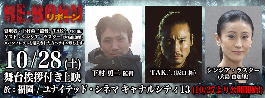 10月28日(土)の20 :00の回の上映前には、下村勇二監督、主演のTAK ∴さんに加え、アクション女優の大島由加里さん(シンシア・ラスター)の舞台挨拶が行われます。