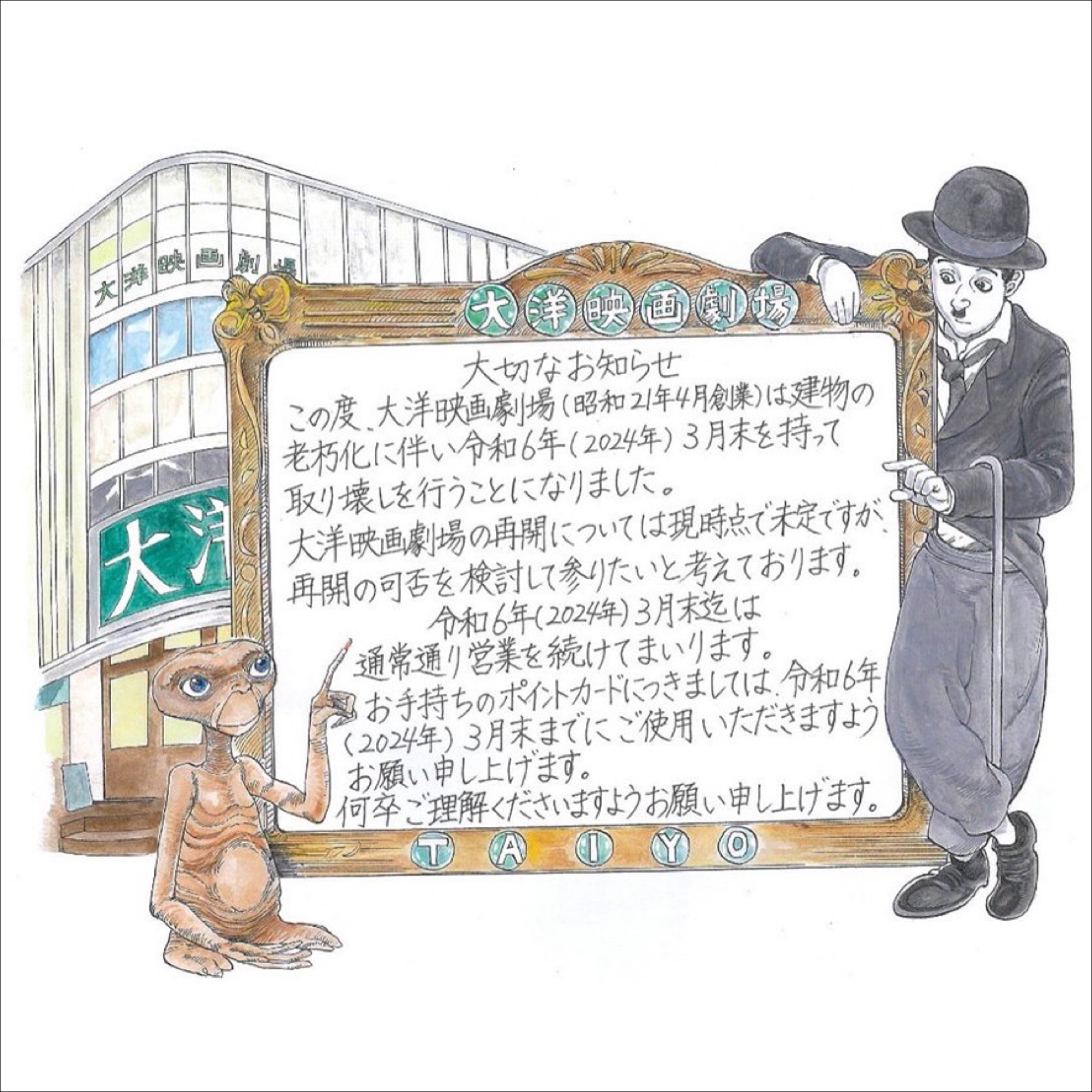 この度、大洋映画劇場(昭和21年4月創業)は、建物の老朽化に伴い令和6年(2024年)3月末を持って取り壊しを行うことになりました。