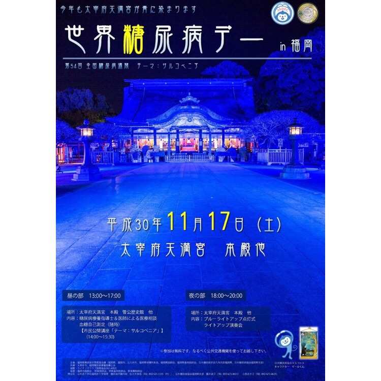 2018年11月17日(土)、福岡県太宰府市の太宰府天満宮にて、世界糖尿病デー2018「ブルーライトアップ in 福岡」が開催されます。