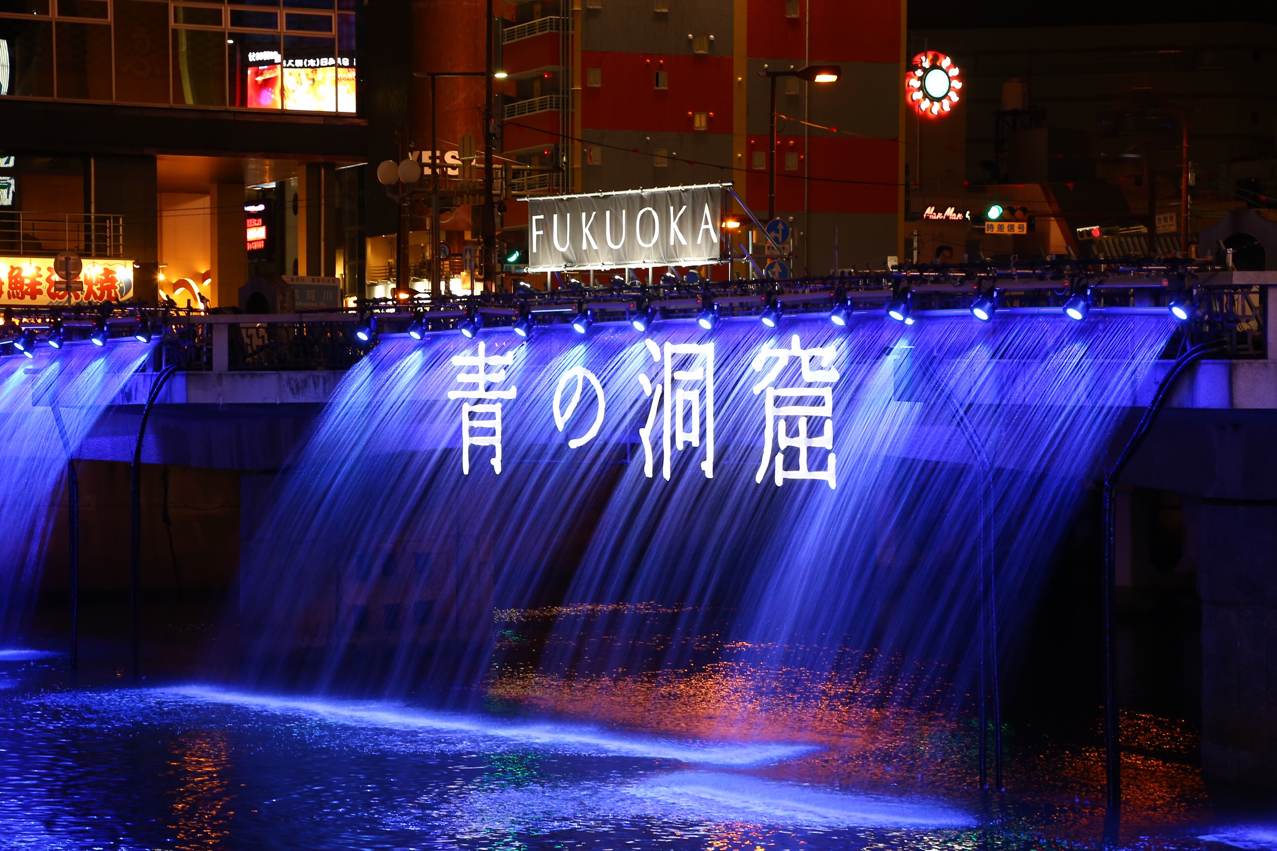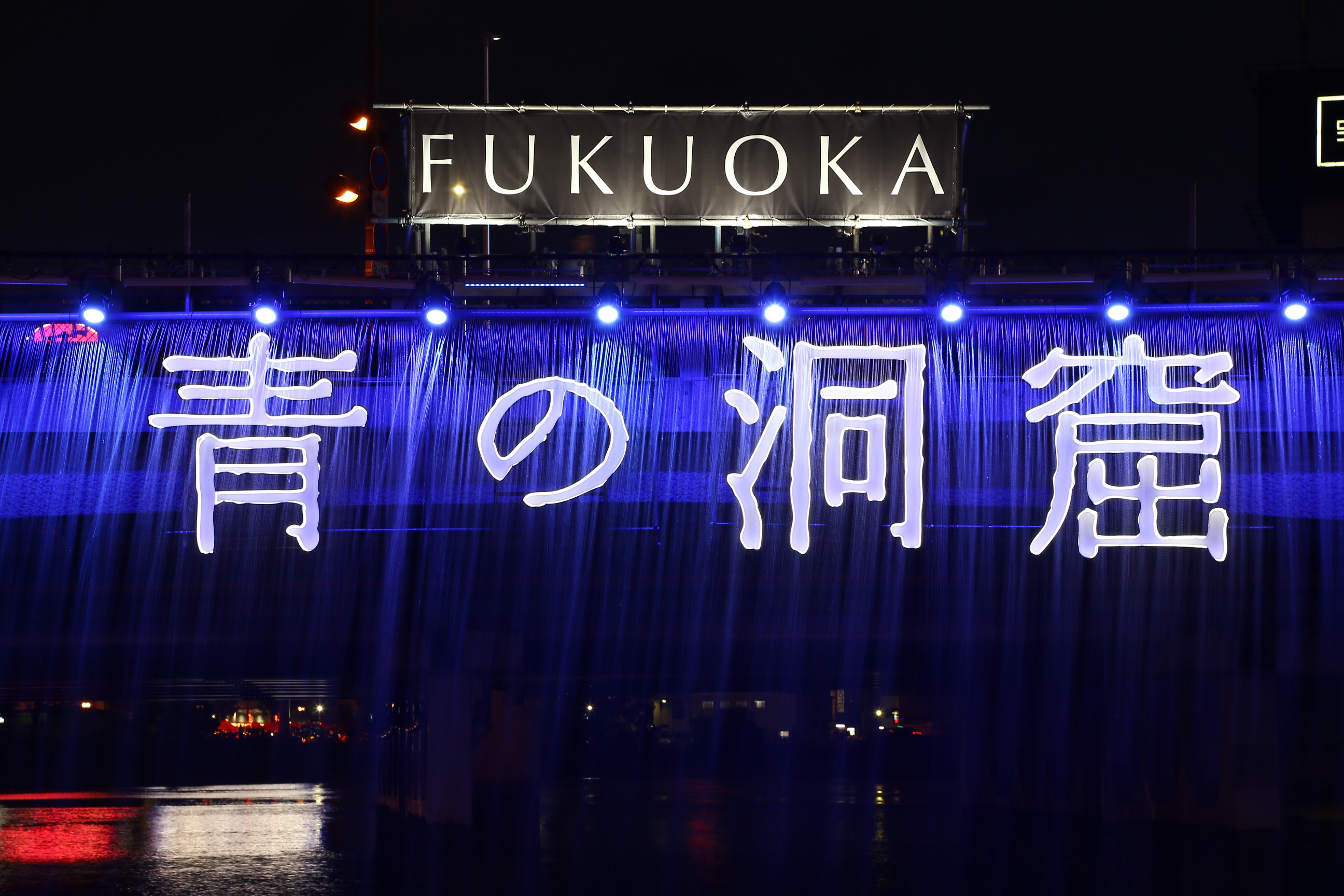 『青の洞窟 FUKUOKA』では、九州一の繁華街・中洲に位置する中洲懸橋に、『青の洞窟』が「青い滝」となって出現します。