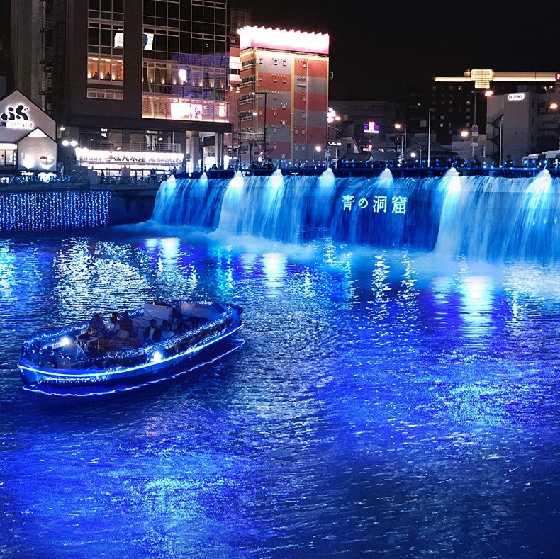 特別な装飾を施したクルーズ船で「青い滝」が流れる橋をくぐり、福博であい橋からキャナルシティ・博多湾までの名所を巡る航路で、幻想的でロマンチックなクルージングをお楽しみいただけます。