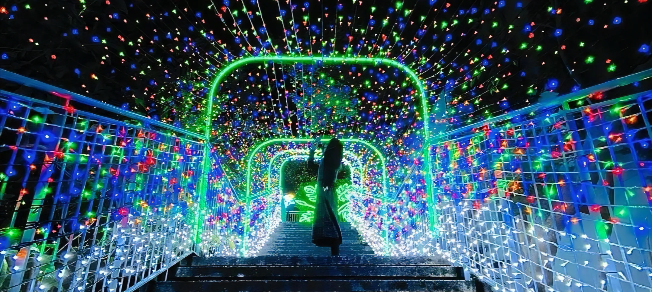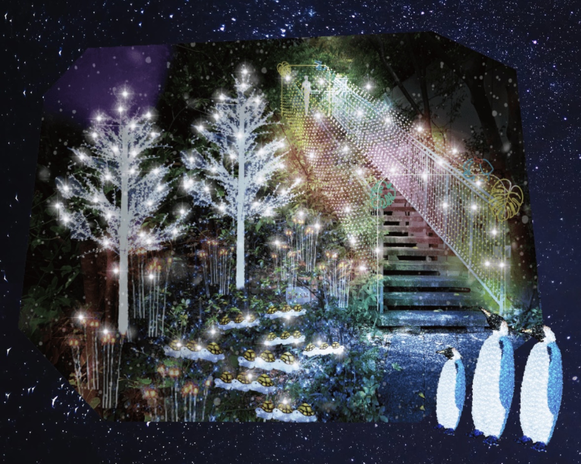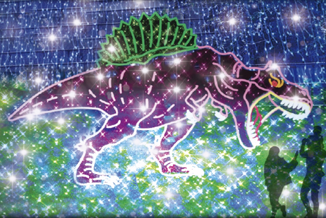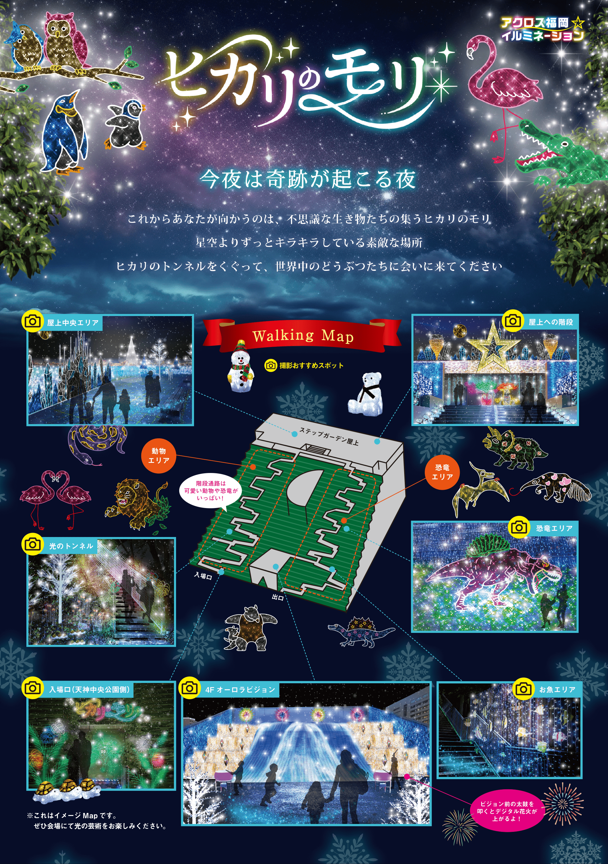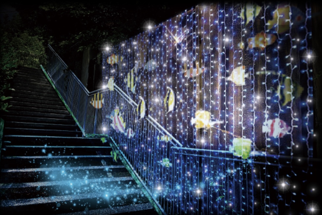 アクロス福岡のステップガーデンの階段通路各所にイルミネーションで作られたかわいい動物や恐竜たちがちりばめられ、光のトンネルやお魚エリアなど美しい演出だけでなく、乗ったら光るステップなどインタラクティブな仕掛けもあり。