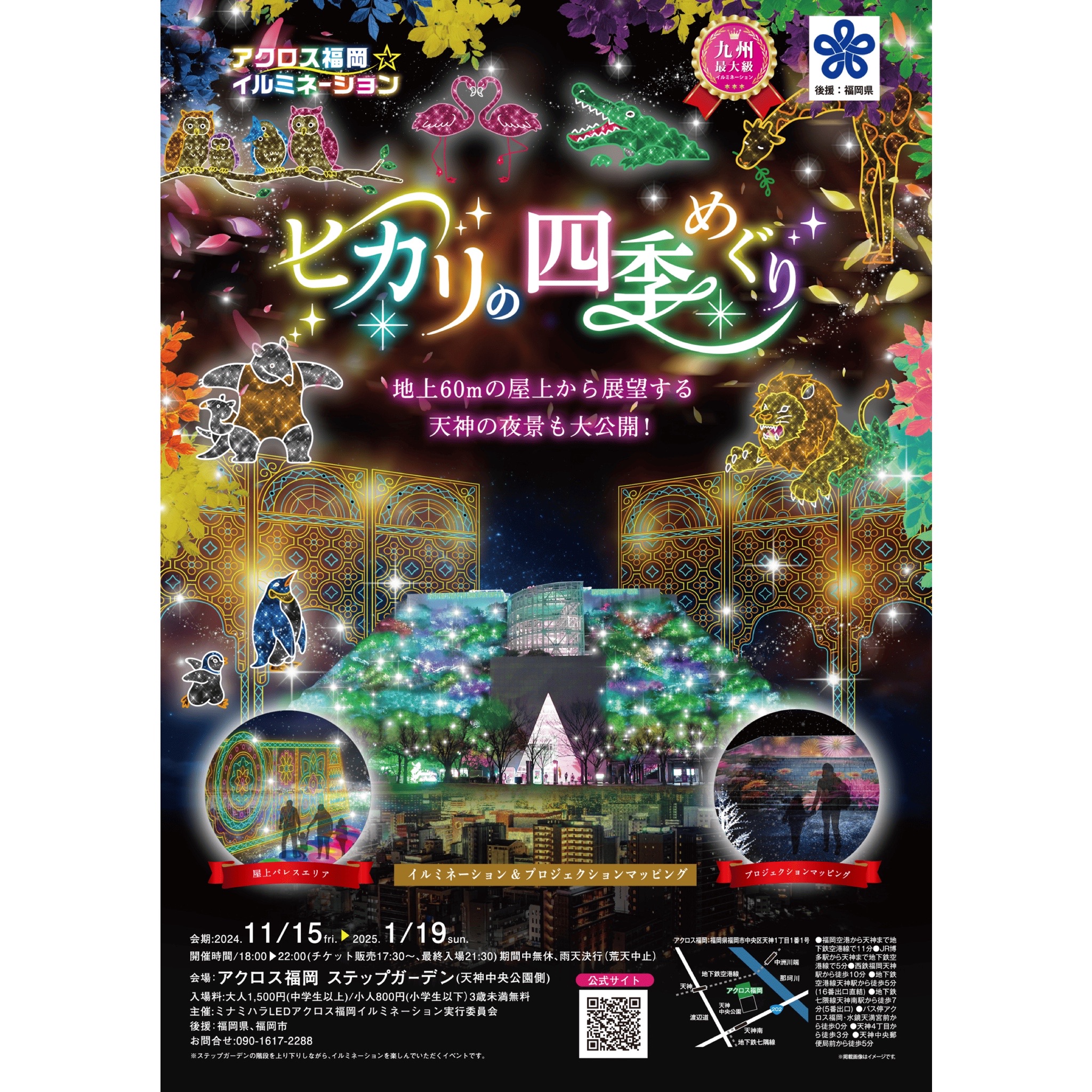 2024年11月15日(金)〜2025年1月19日(日)の66日間、福岡県福岡市中央区天神のアクロス福岡のステップガーデンにて、「アクロス福岡イルミネーション -ヒカリの四季めぐり-」が開催されます。