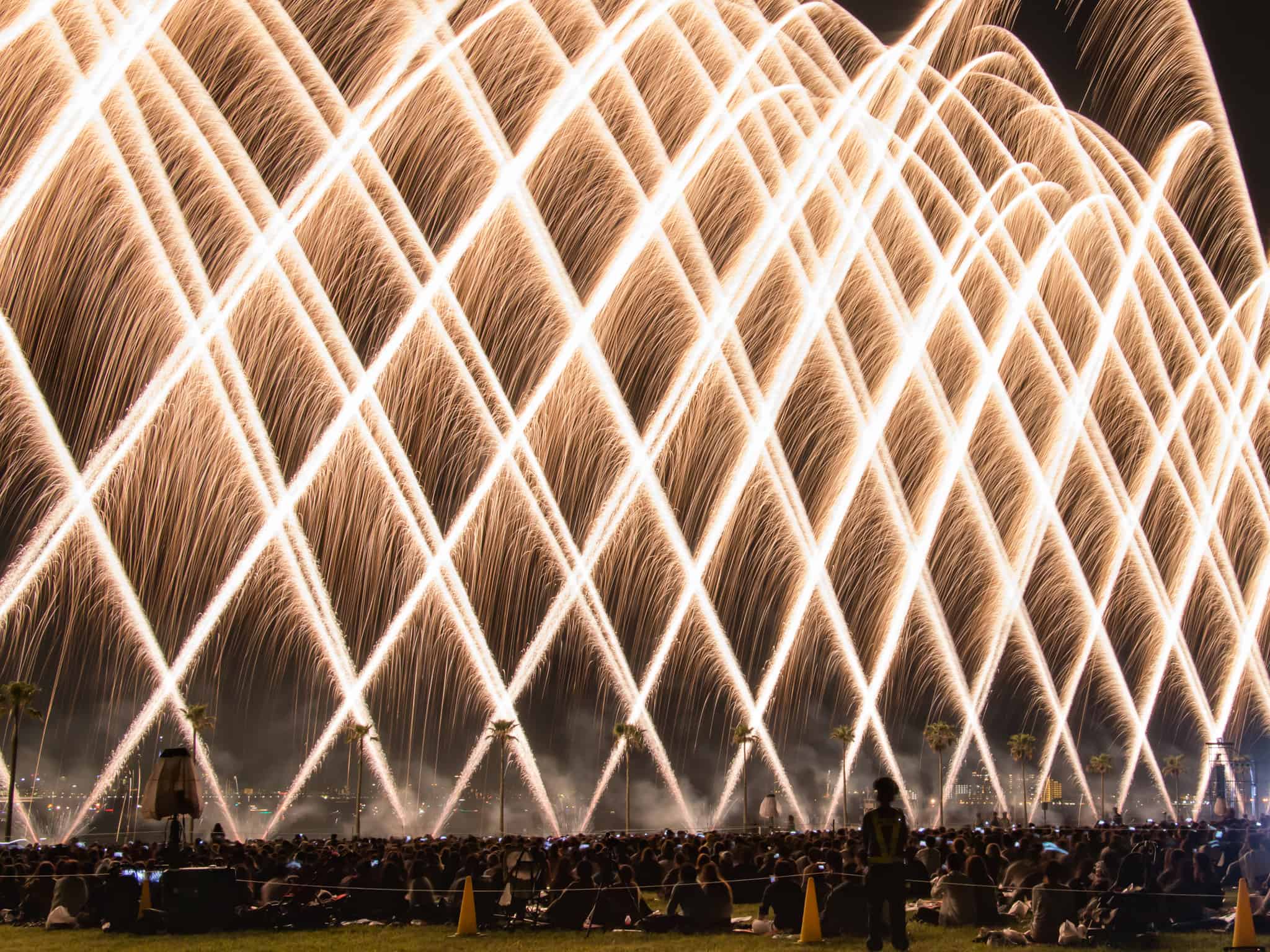 滞空時間、残存光を計算に入れ、1/30秒単位でコントロールされる花火は音楽のリズム・メロディー・楽器・歌詞・ボーカルに合わせて演出します。