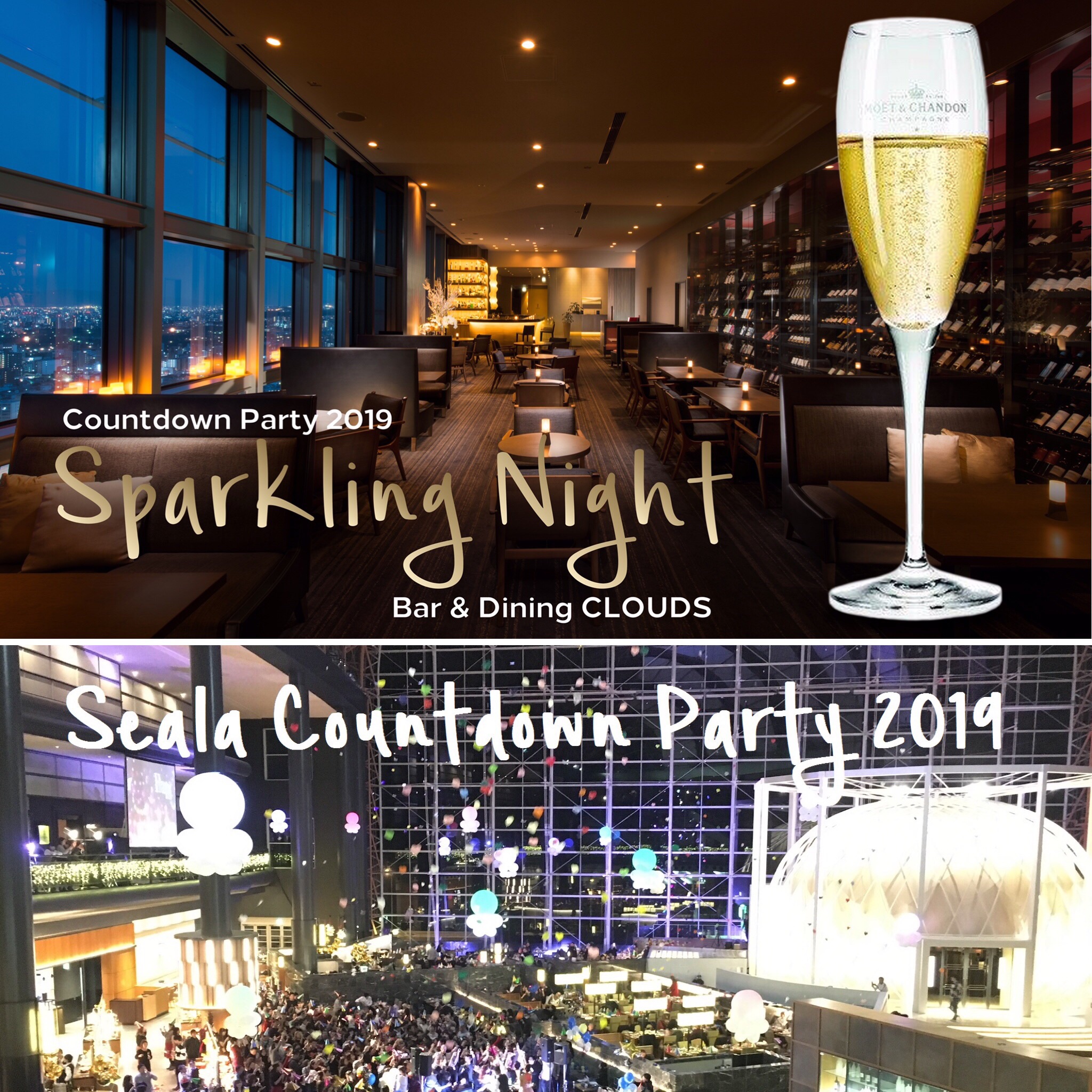 2018年12月31日(月)22時30分〜24時30分、ヒルトン福岡シーホーク4Fのブラッセリー&ラウンジ「シアラ」と35Fのバー&ダイニング「クラウズ」の2箇所において、スタイルの異なる2つのカウントダウンパーティが開催されます。