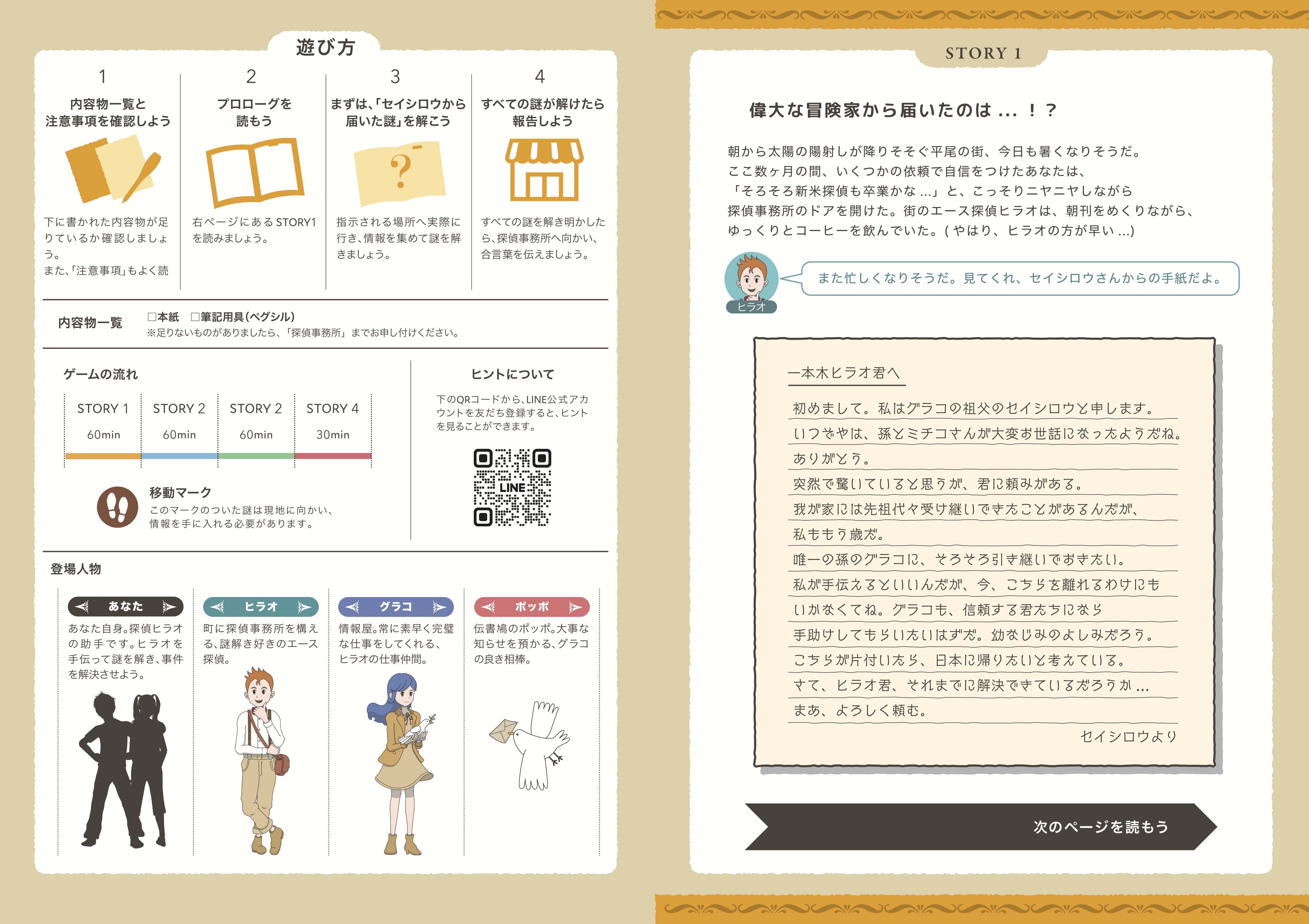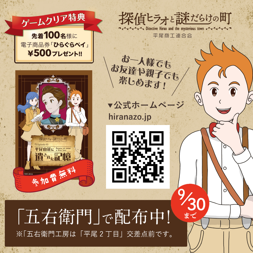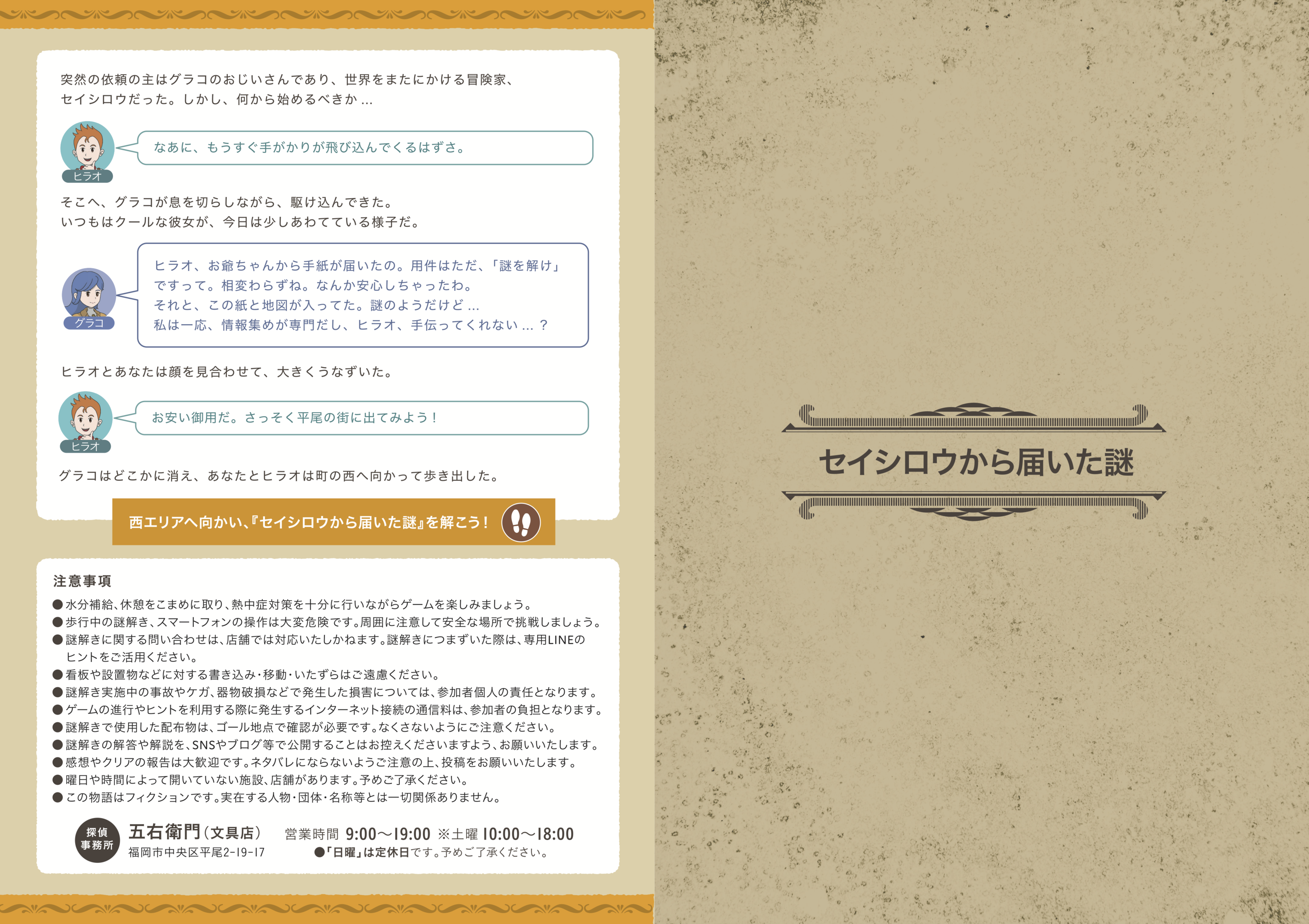 今回が3回目の開催で、参加者は平尾に探偵事務所に構える探偵ヒラオの助手となって、情報屋グラコもいっしょに、平尾の町の『最後の謎』を解き明かします。