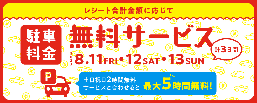 当日館内店舗でのご利用レシート合計金額(税込・合算可)に応じて、駐車料金無料のサービスを実施いたします。