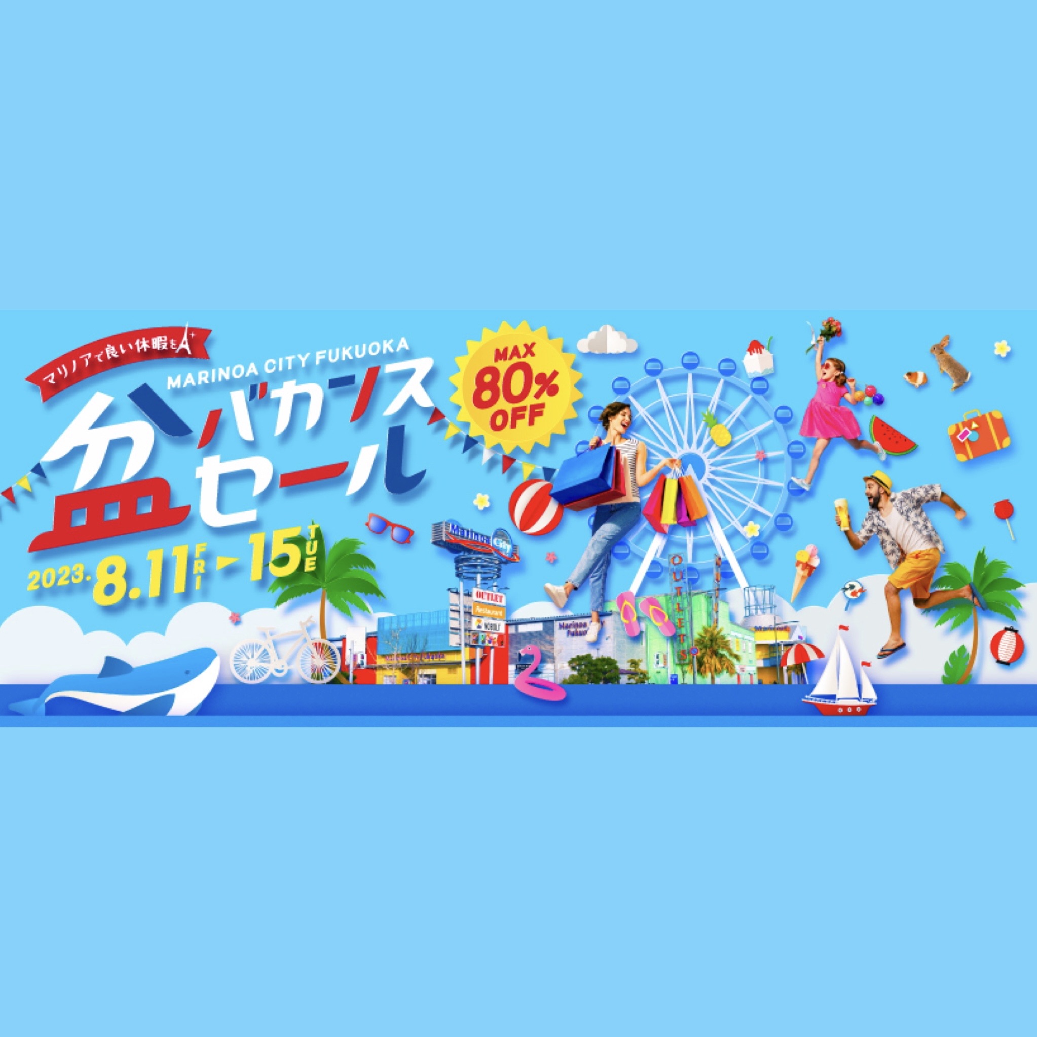 2023年8月11日(金・祝)〜15日(火)のお盆期間の5日間、福岡県福岡市西区小戸のマリノアシティ福岡にて、「盆バカンスセール」が開催されます。