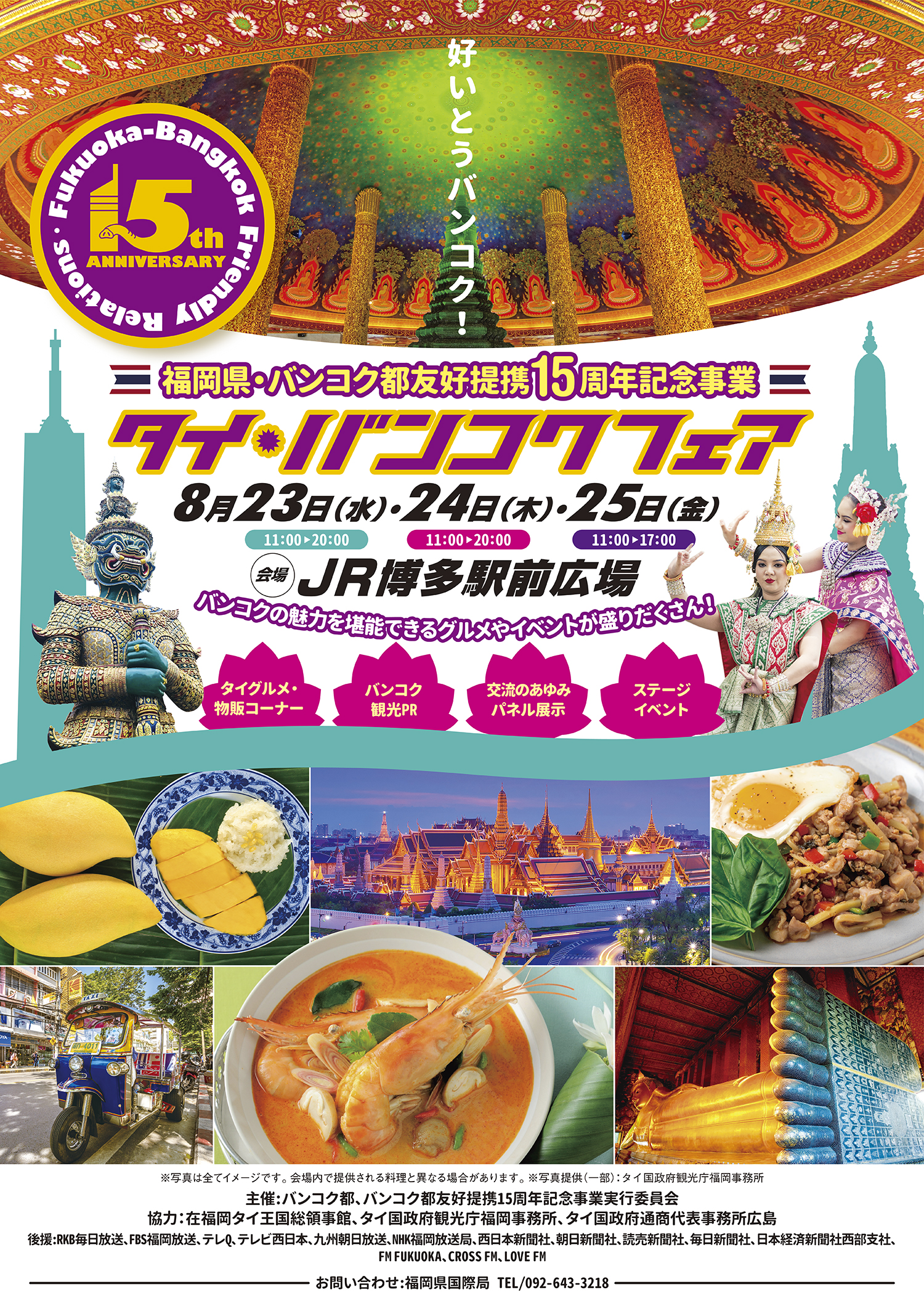 2023年8月23日(水)〜25日(金)の3日間、福岡県福岡市博多区のJR博多駅前広場にて、福岡県・バンコク都友好提携15周年記念事業「タイ・バンコクフェア」が開催されます。