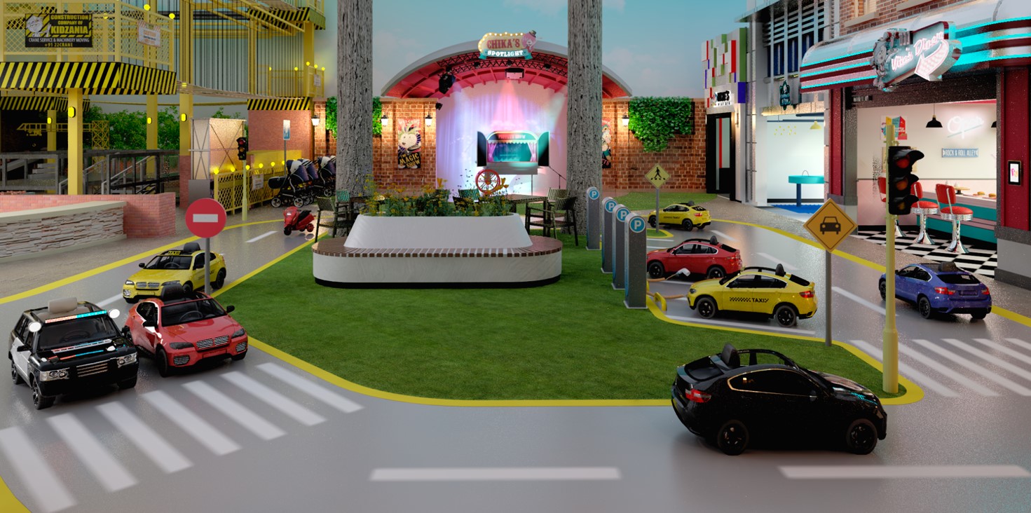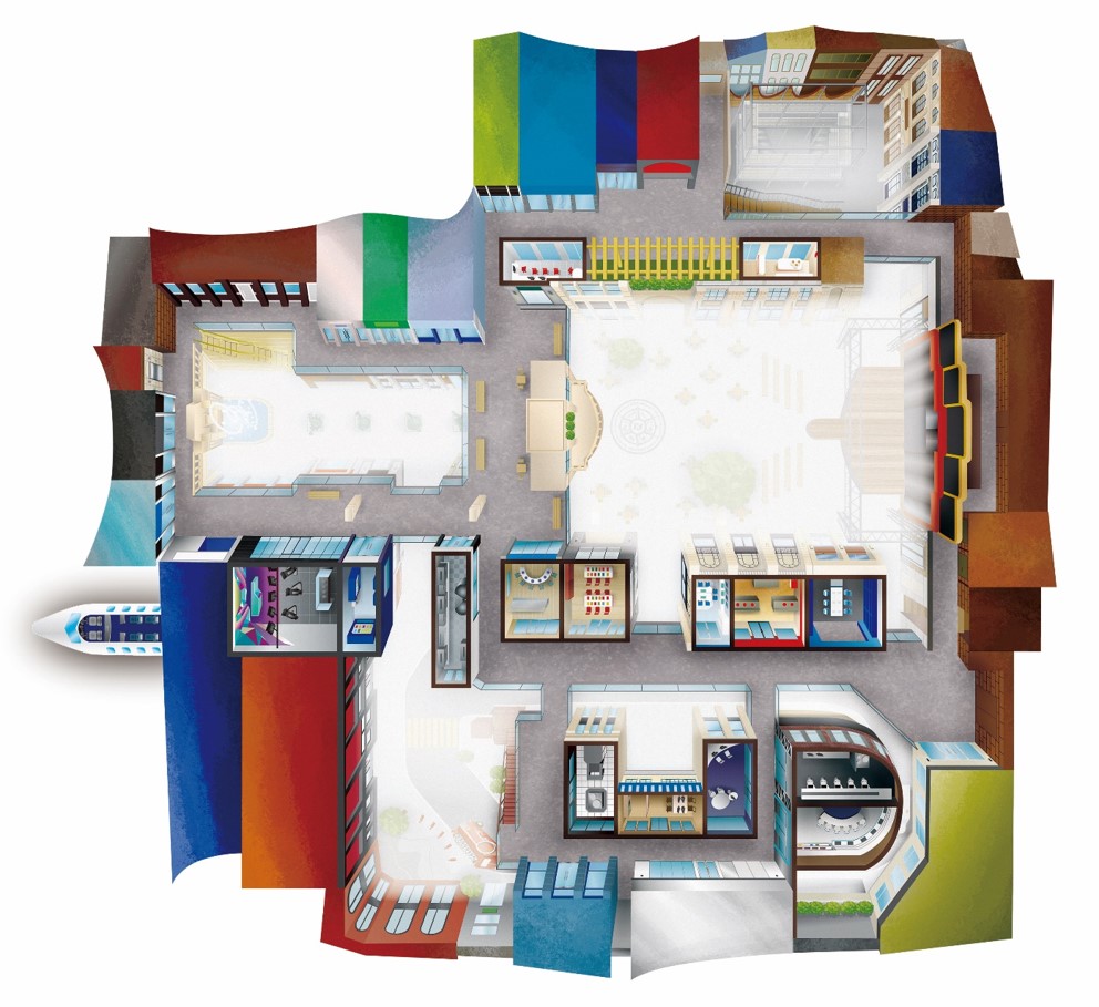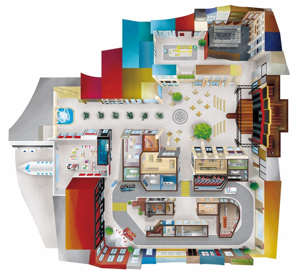 空港の先には、約2/3サイズで現実社会を表現したおよそ2,000坪(6,600平米)の「こどもが主役の街」が広がり、3歳から15歳のこども達は、約60のパビリオンで約100種類の仕事やサービスを体験できます。