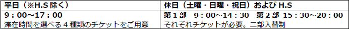 ※平日でも二部入替制となる場合や、イベントなどにより営業時間が異なる場合があります。