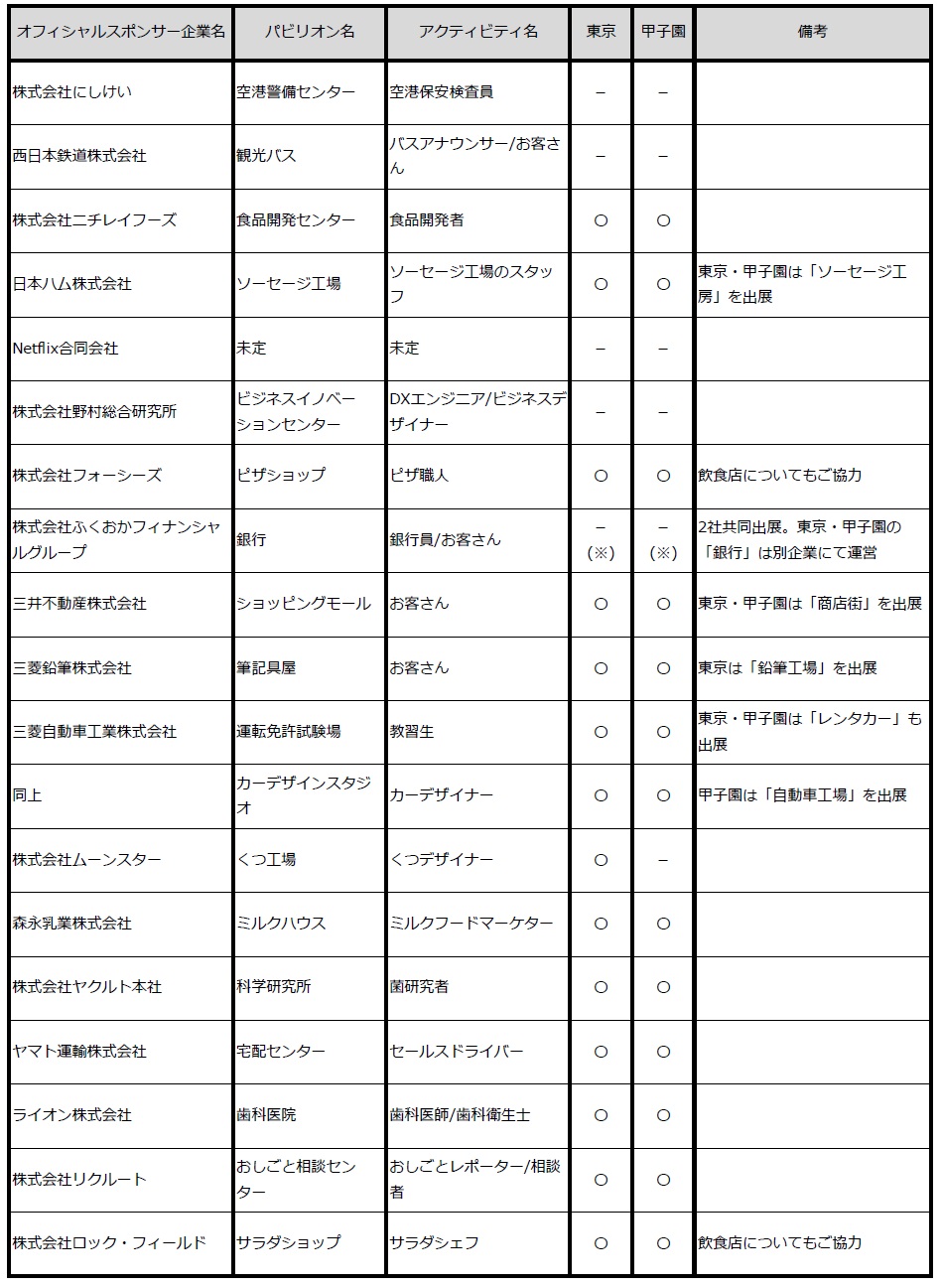 「東京」は「キッザニア東京」への出展有無、「甲子園」は「キッザニア甲子園」への出展有無を表します。