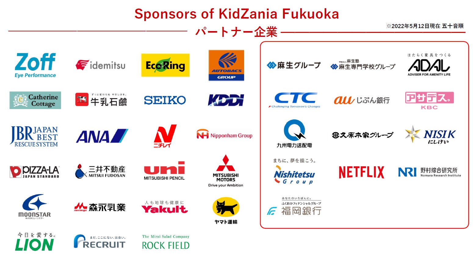 株式会社麻生、学校法人麻生塾、出光興産株式会社、伊藤忠テクノソリューションズ、株式会社インターメスティック、auじぶん銀行株式会社、株式会社エコリング、株式会社オートバックスセブン、九州朝日放送株式会社、九州電力送配電株式会社、牛乳石鹸共進社株式会社、株式会社久原本家グループ本社、KDDI株式会社、ジャパンベストレスキューシステム株式会社、全日本空輸株式会社、株式会社にしけい、西日本鉄道株式会社、株式会社ニチレイフーズ、日本ハム株式会社、Netflix合同会社、株式会社野村総合研究所、株式会社フォーシーズ、株式会社ふくおかフィナンシャルグループ、三井不動産株式会社、三菱鉛筆株式会社、三菱自動車工業株式会社、株式会社ムーンスター、森永乳業株式会社、株式会社ヤクルト本社、ヤマト運輸株式会社、ライオン株式会社、株式会社リクルート、株式会社ロック・フィールド