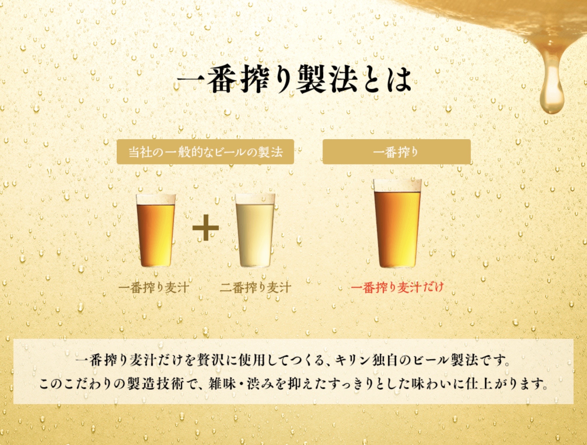 一番搾り麦汁だけを贅沢に使用してつくる、キリン独自のビール製法です。