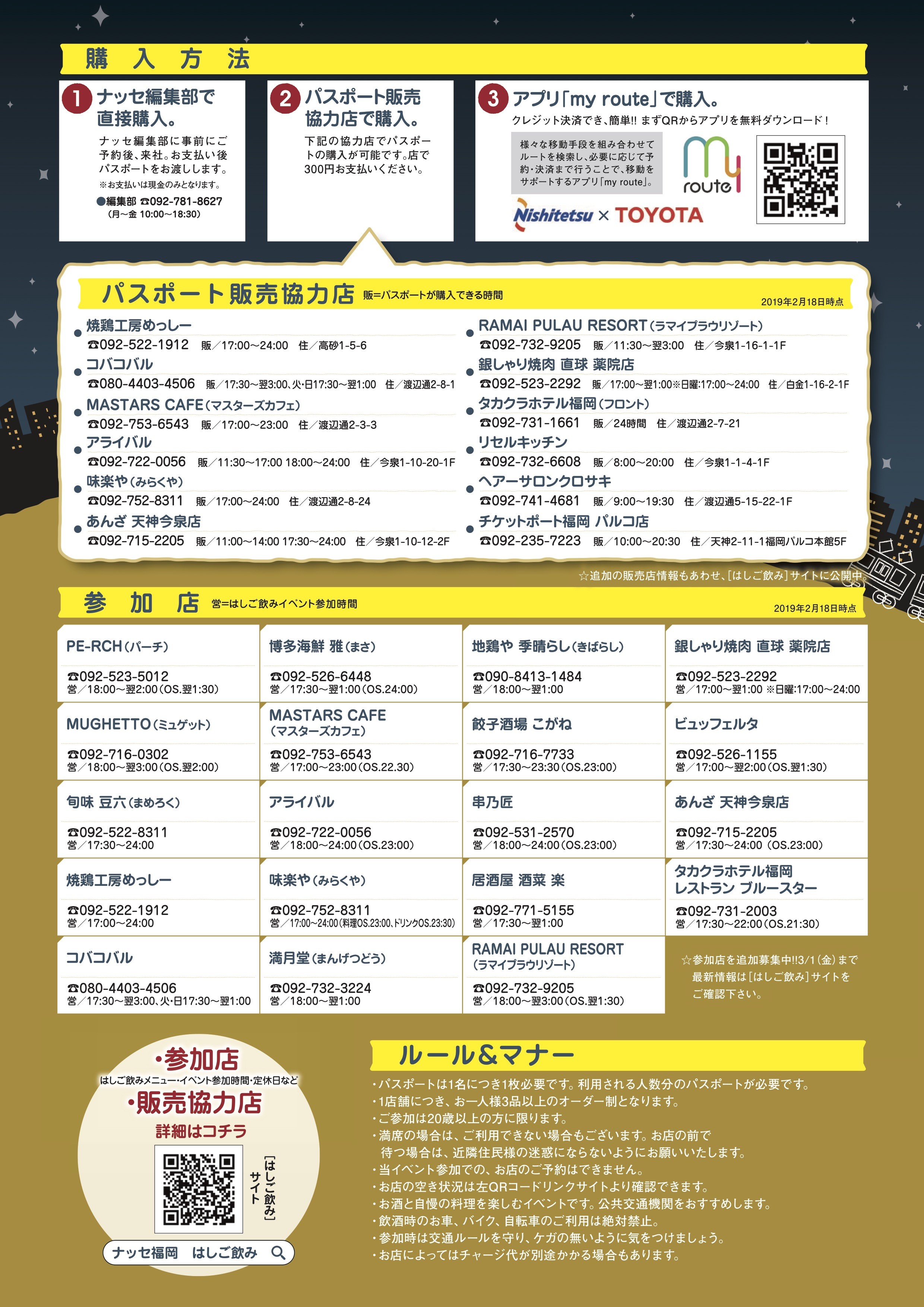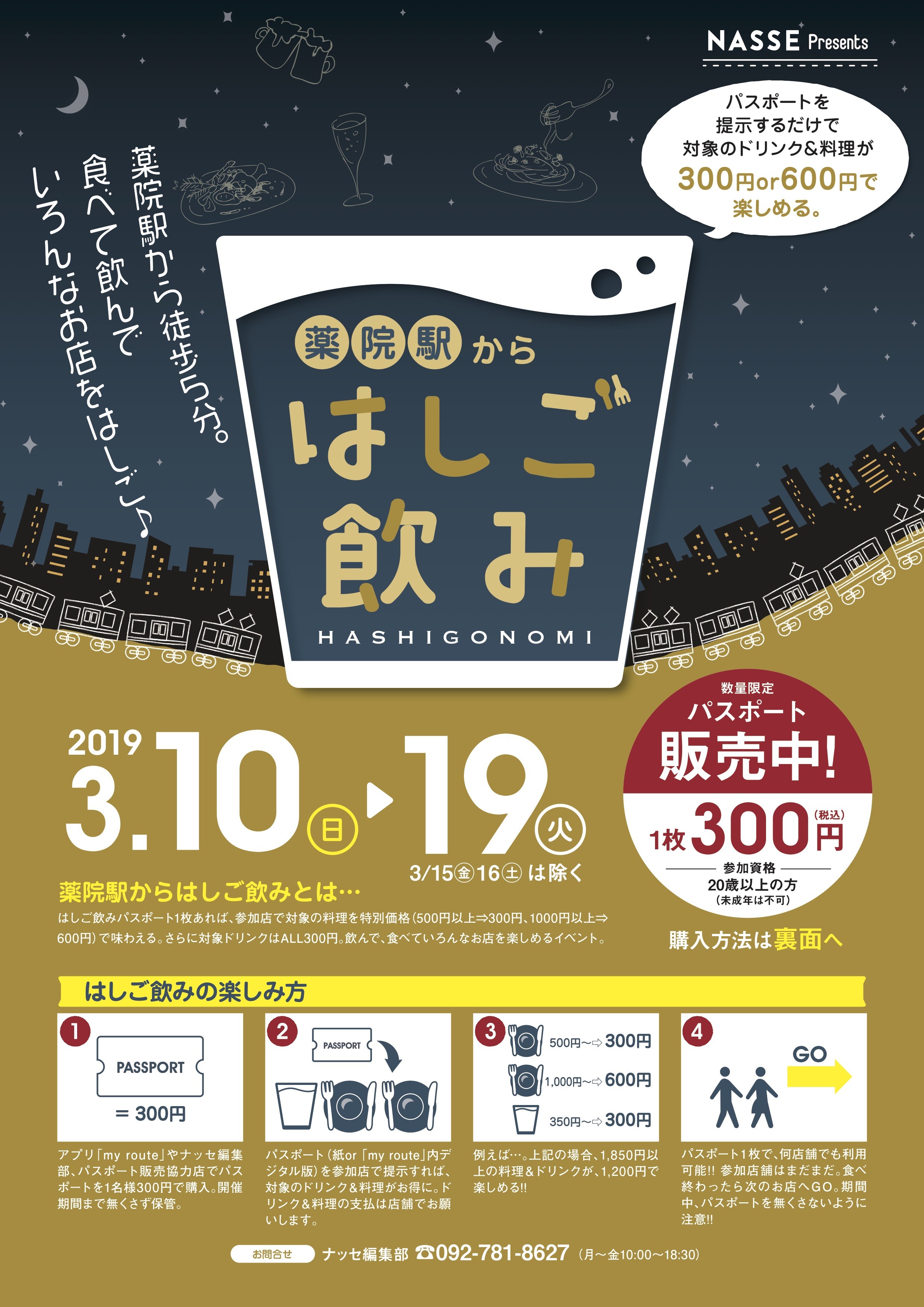 2019年3月10日(日)〜19日(火)(3/15金と16土は除く)の期間、ナッセ福岡編集部主催「薬院駅からはしご飲み」が開催されます。