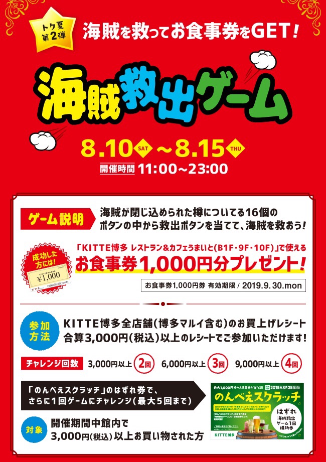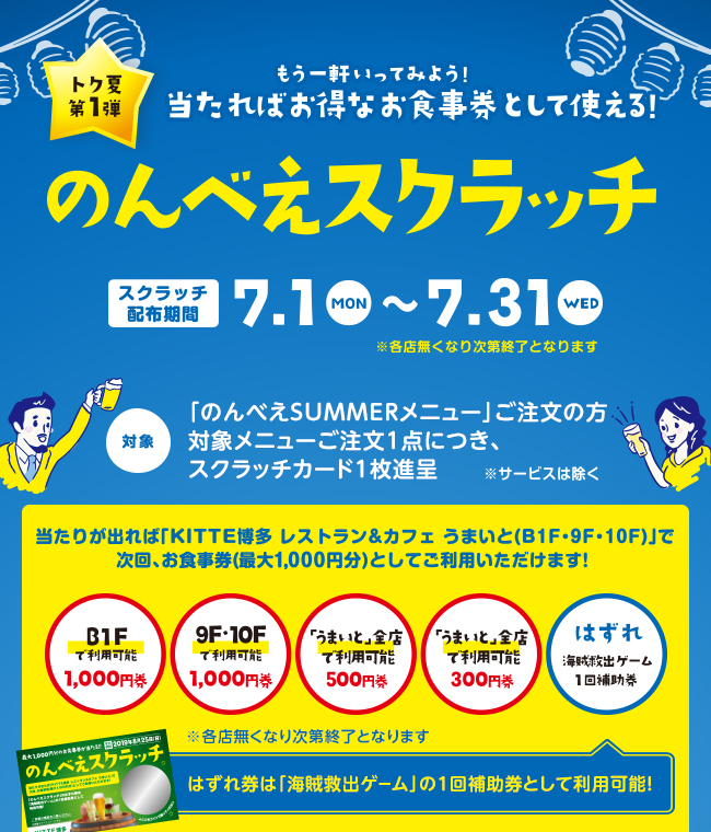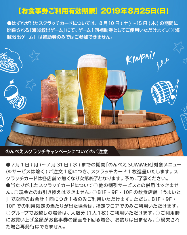 また、7月1日(月)から7月31日(水)までの期間は、当たりが出れば次回お会計時から最大1,000円分のお食事券として使用できる「のんべえスクラッチ」や、8月10日(土)から8月15日(木)までの期間は、1,000円分のお食事券が当たる「海賊救出ゲーム」など、お得なキャンペーンも同時開催いたします。
