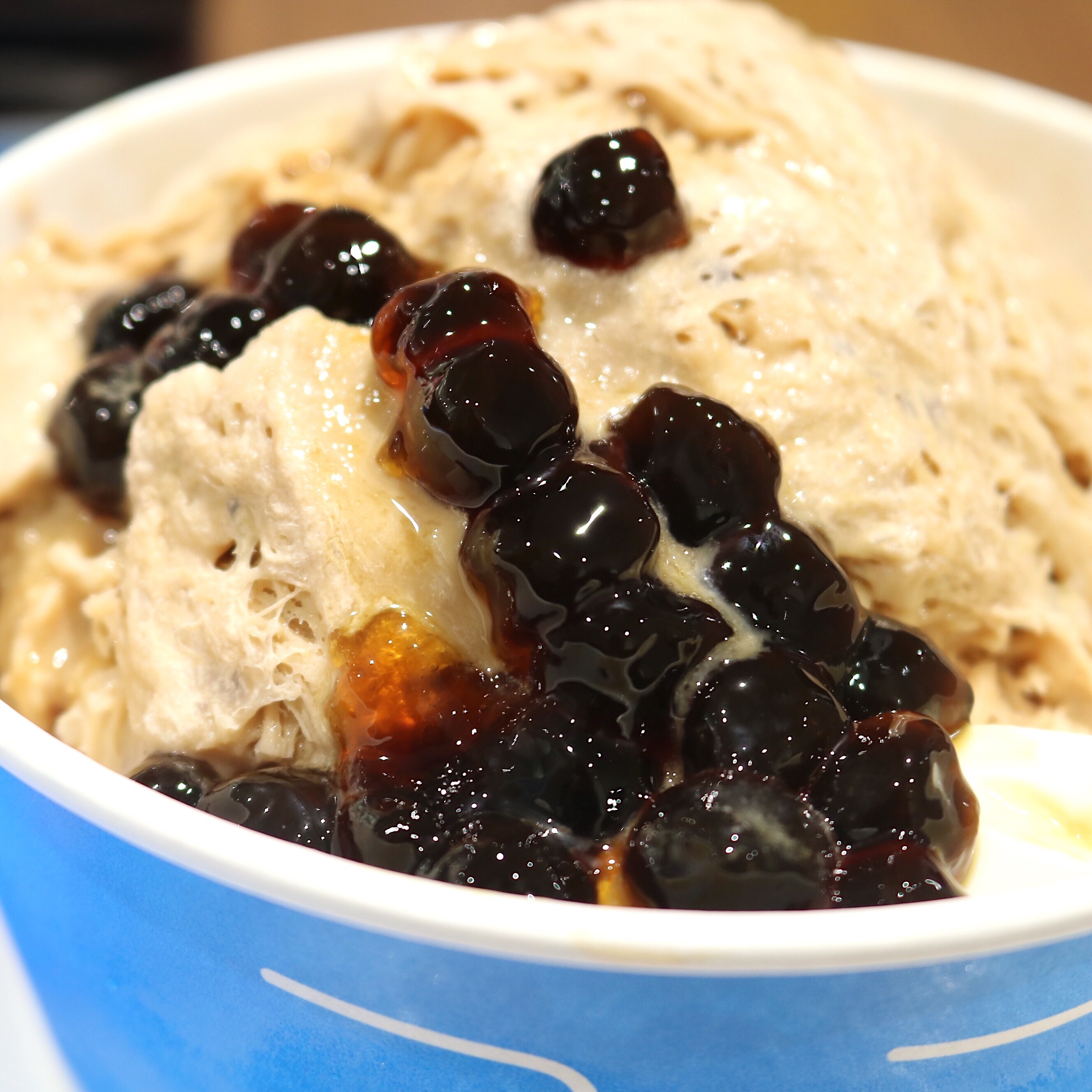 濃厚なミルクティーアイスブロックを削り、キャラメルソースをかけ、クリーミーなパンナコッタをトッピング。 温かいタピオカをお好みで合わせて食べる、台湾でも人気のメニュー。