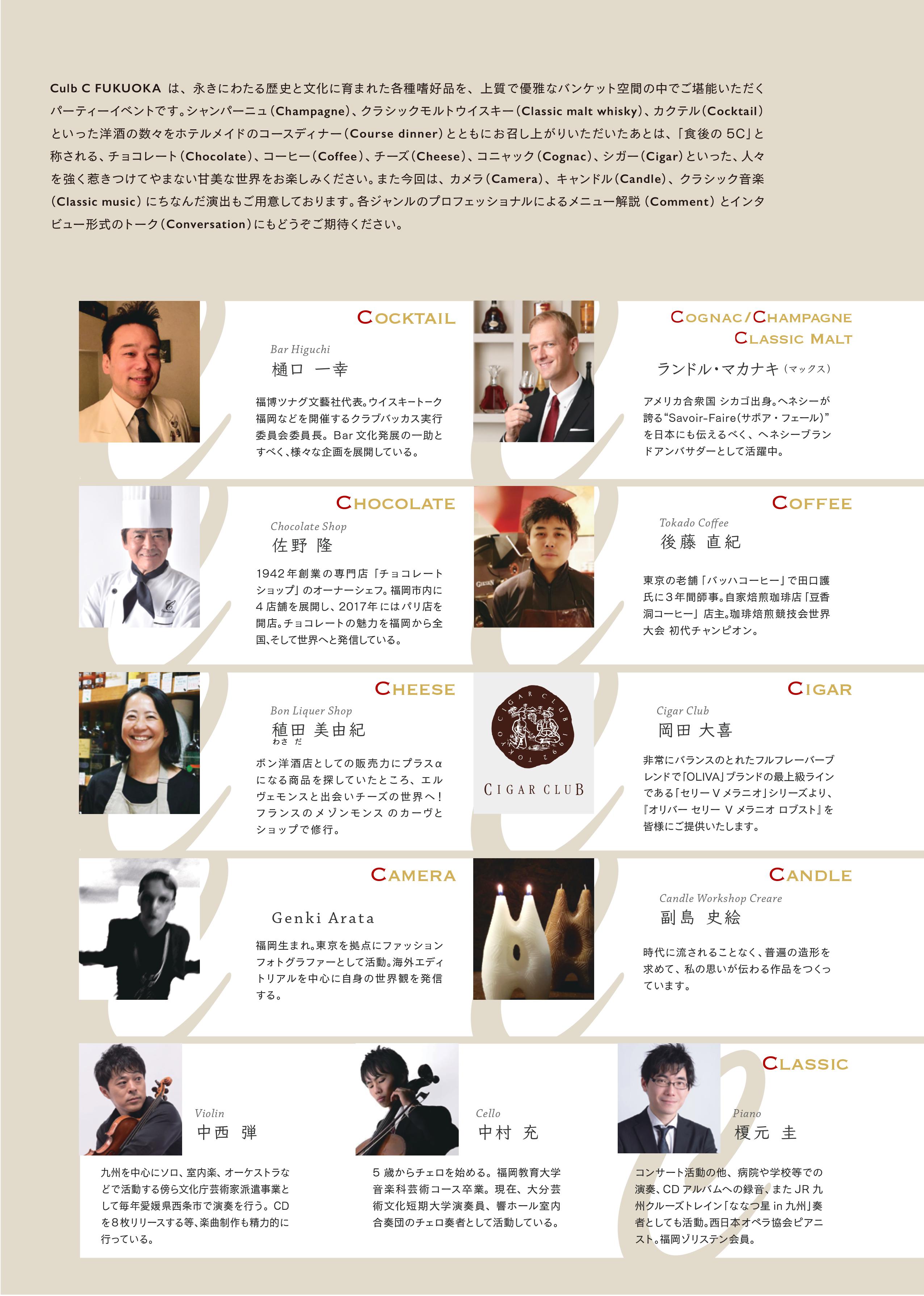 このイベントは、九州最大のウイスキーの祭典『ウイスキートーク福岡』の企画・広報を担う非営利団体「福博ツナグ文藝社」が主催するもので、シャンパーニュ(Champagne)、クラシックモルトウイスキー(Classic malt whisky)、カクテル(Cocktail)といった洋酒の数々がホテルメイドのコースディナー(Course dinner)とともに提供され、アフターディナーには「食後の5C」と称される、チョコレート(Chocolate)、コーヒー(Coffee)、チーズ(Cheese)、コニャック(Cognac)、シガー(Cigar)といった嗜好品が味わえる、年に一度の特別企画。