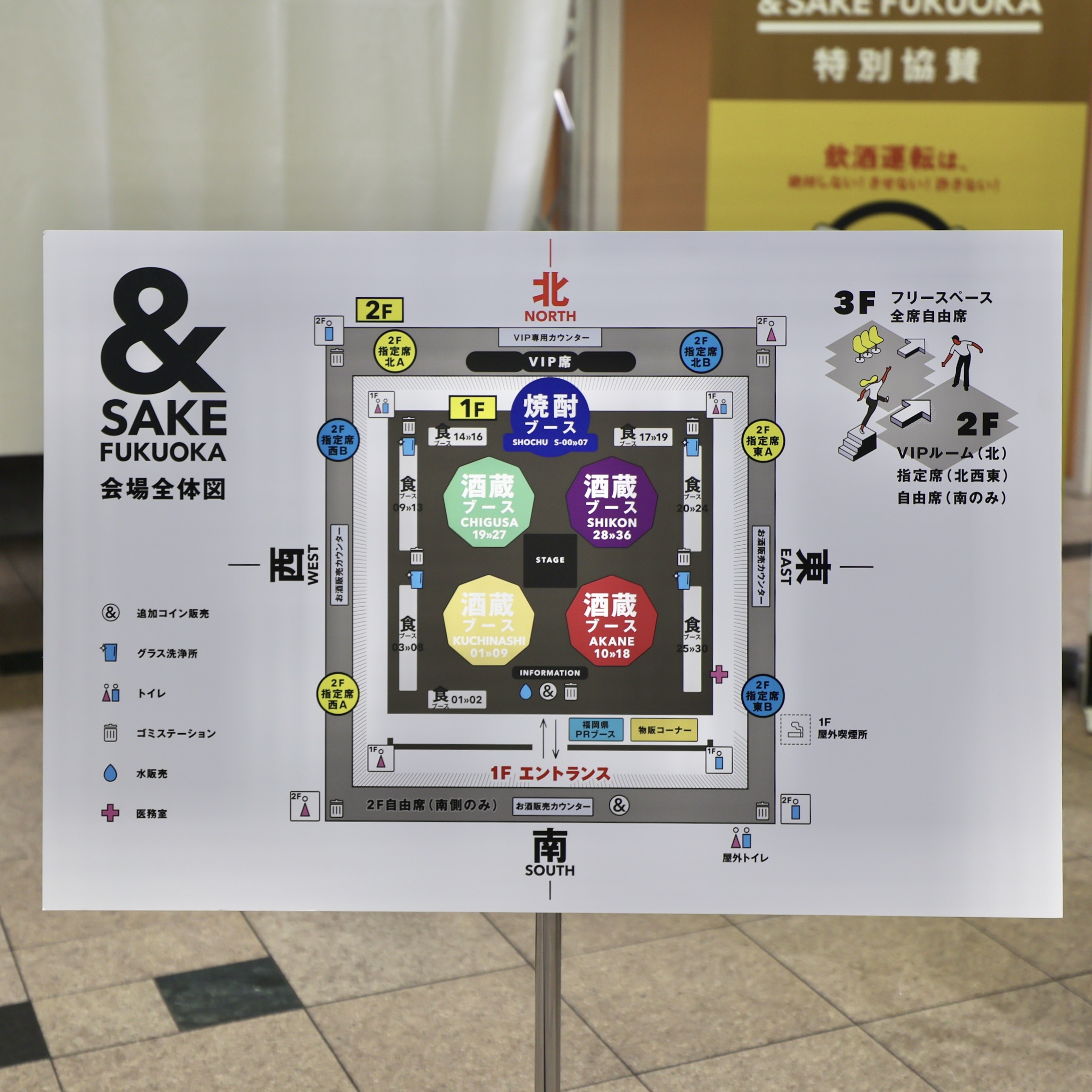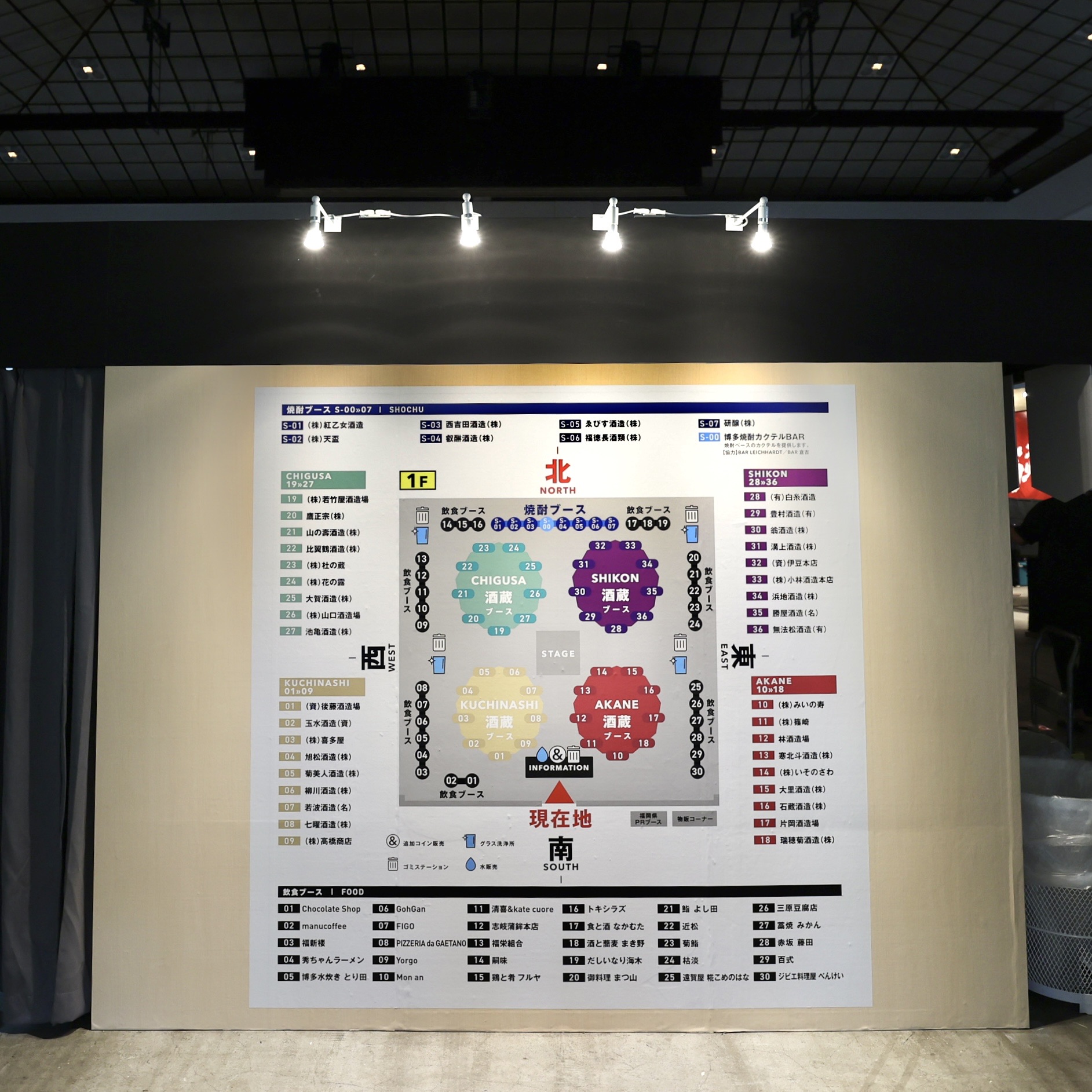 中央にステージ、その周りに、総合案内所(INFORMATION)、AKANE酒蔵ブース、KUCHINASHI酒蔵ブース、CHIGUSA酒蔵ブース、SHIKON酒蔵ブース、焼酎ブース、飲食ブースがあります。