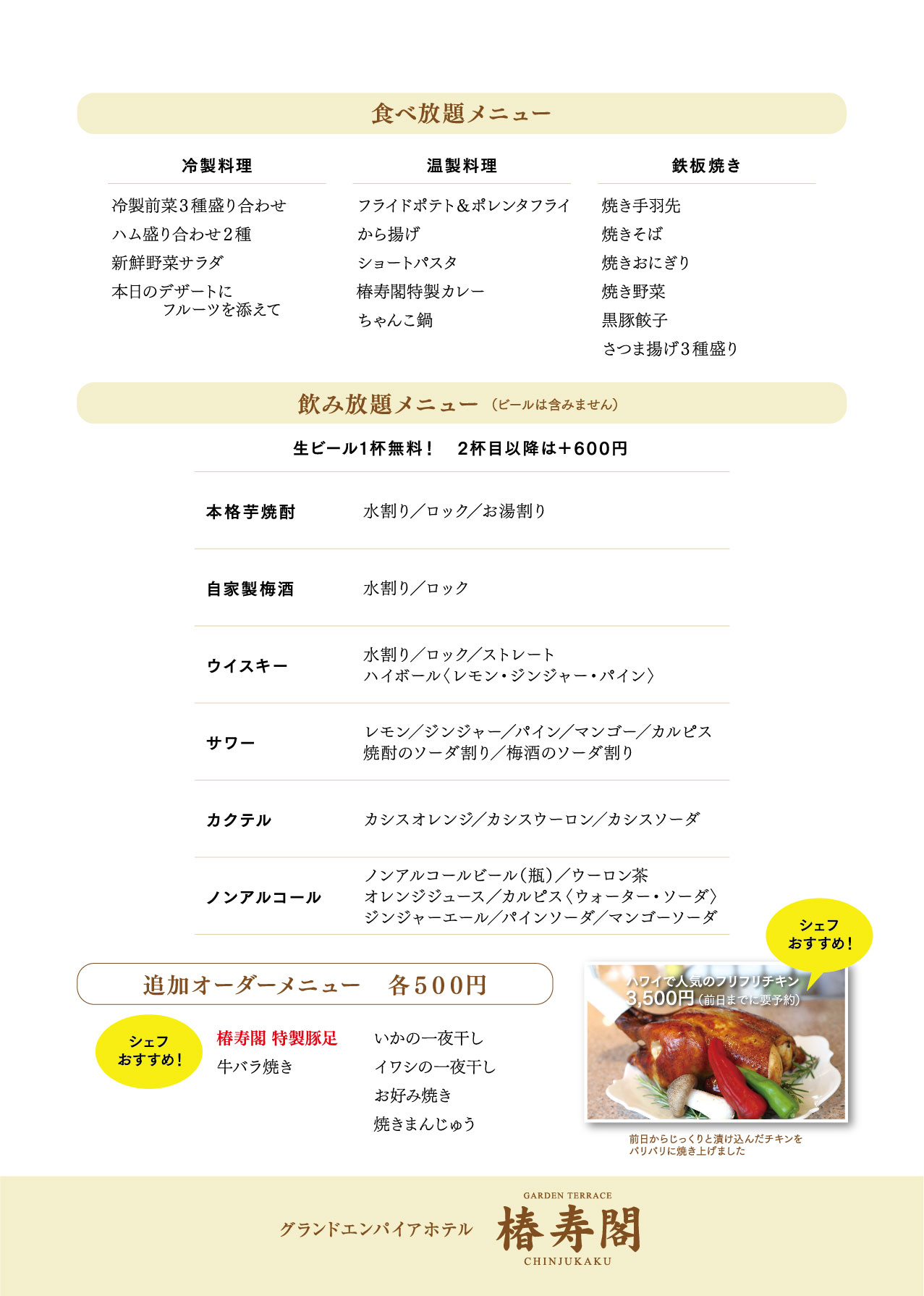 冷製前菜3種盛り合わせ/ハム盛り合わせ/新鮮野菜サラダ/フライドポテト&ポレンタフライから揚げ/ショートパスタ/椿寿閣特製カレー/ちゃんこ鍋/焼き手羽先/焼きそば/焼きおにぎり 焼き野菜/黒豚餃子/さつま揚げ 3種盛り/本日のデザート