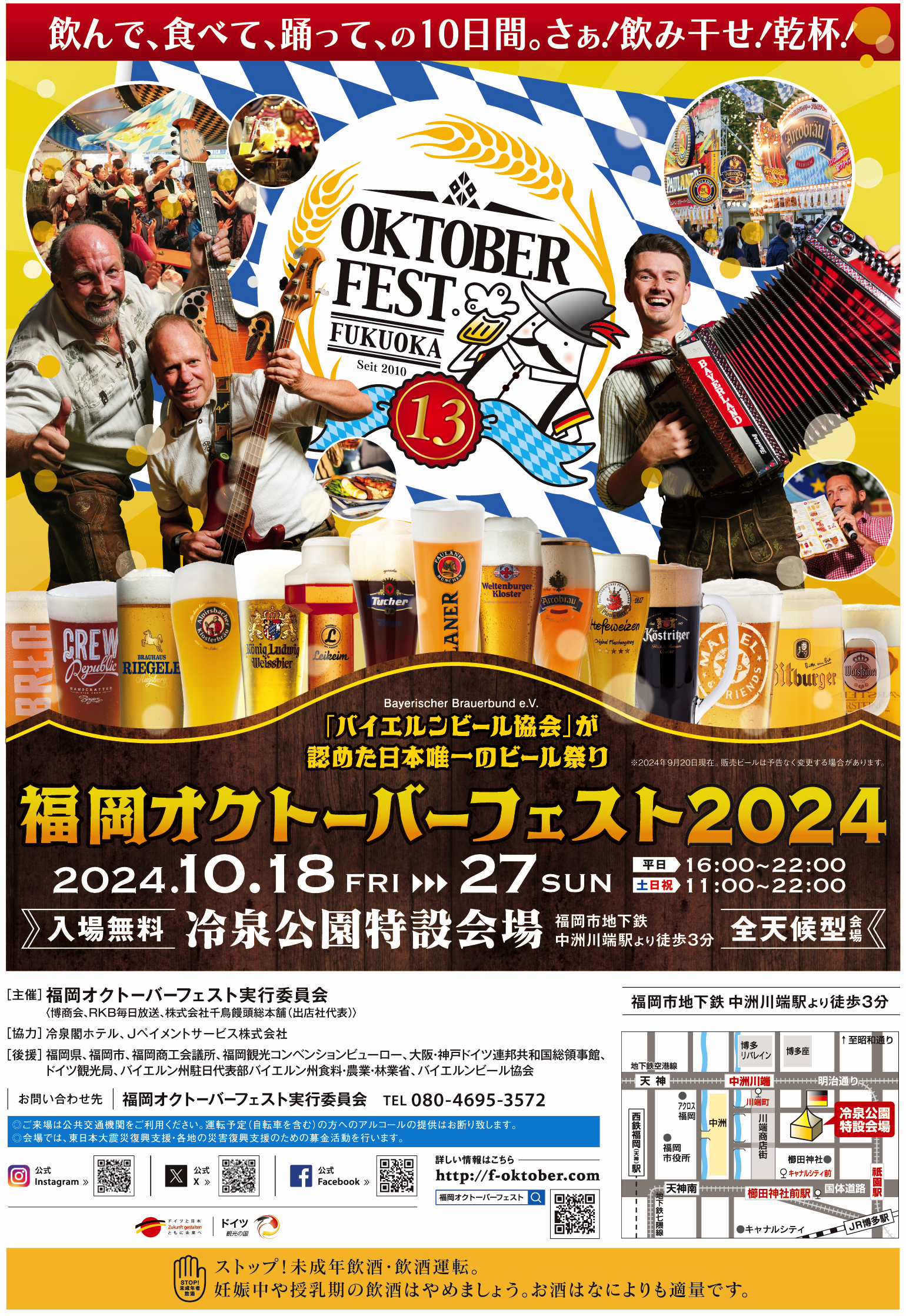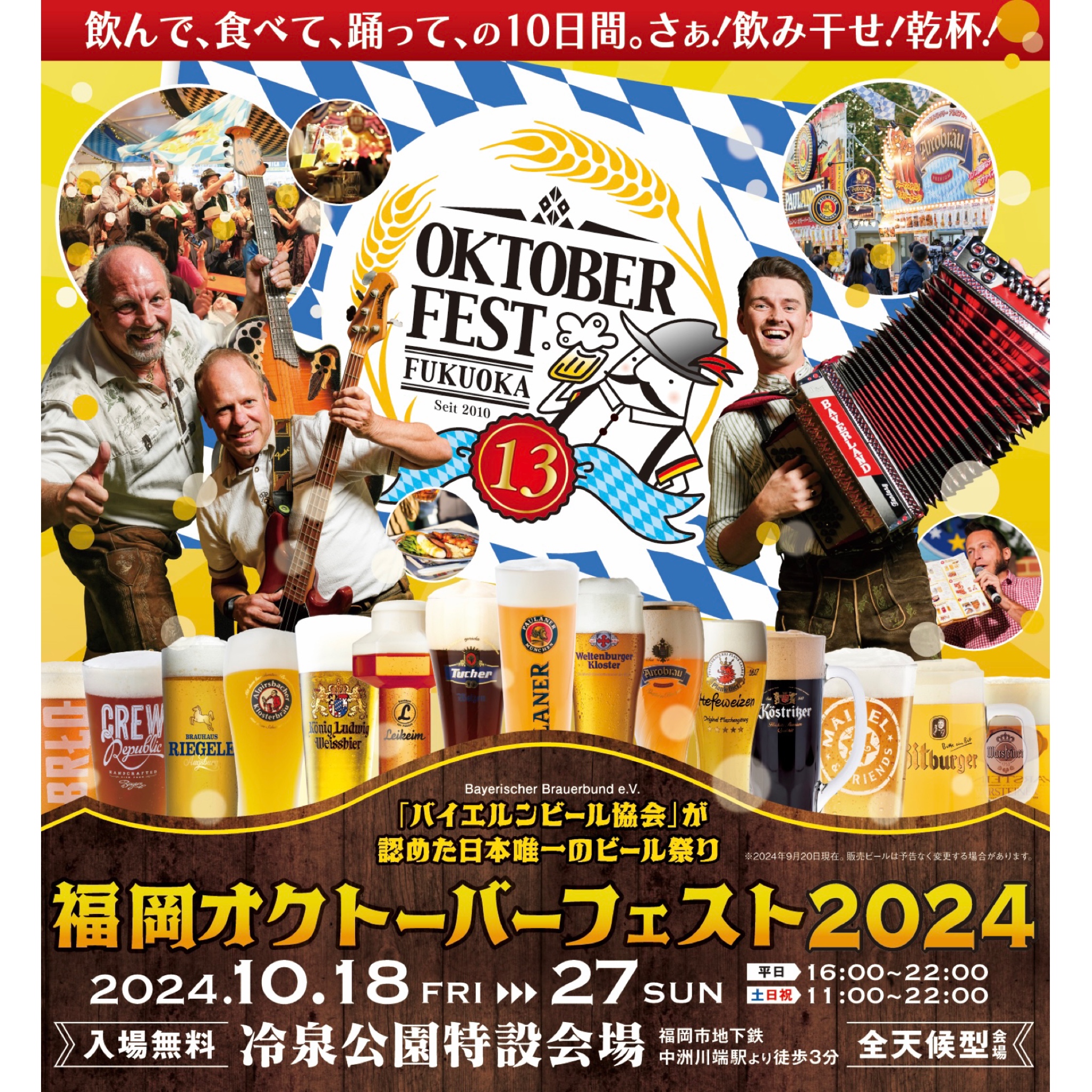 福岡オクトーバーフェストは、本場ミュンヘンで1810年から開催されている世界最大のビール祭りを模し、博多を代表する伝統的な祭りが多い福博エリアの新たなお祭りとして、博多区・冷泉公園で2010年にスタートし、今年で13回目を迎えます。