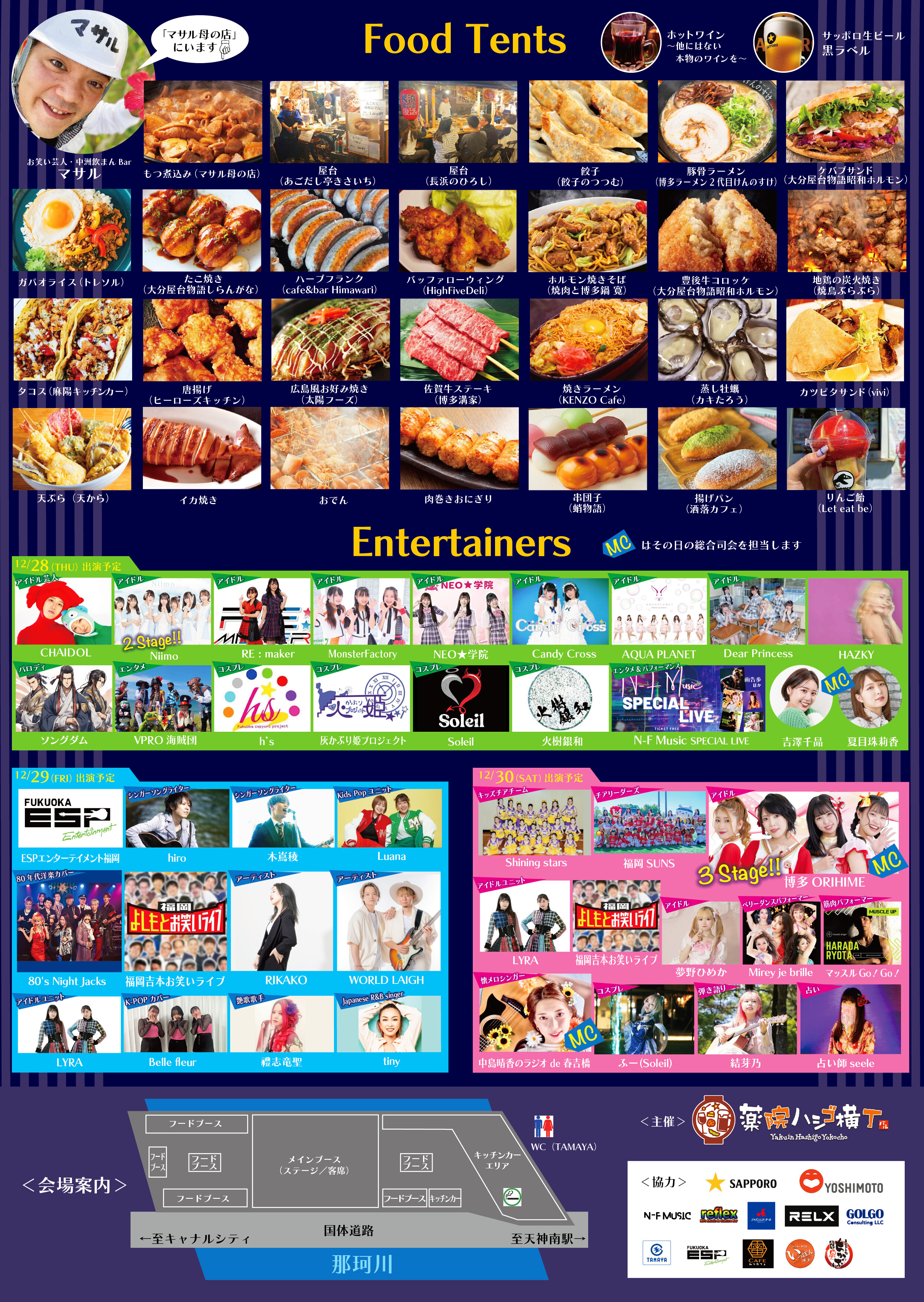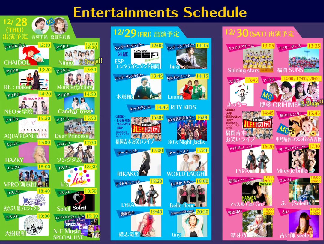 25店舗〜の地元グルメや、福岡吉本のお笑いライブはじめエンタメパフォーマー、地元の華やか なアイドルグループのステージなど変わらずの盛りだくさんに加え、前回にはなかったコンテン ツとしてベリーダンスやキッズチアのチームなど、年齢を問わず楽しめる豊富なラインナップが登場します。