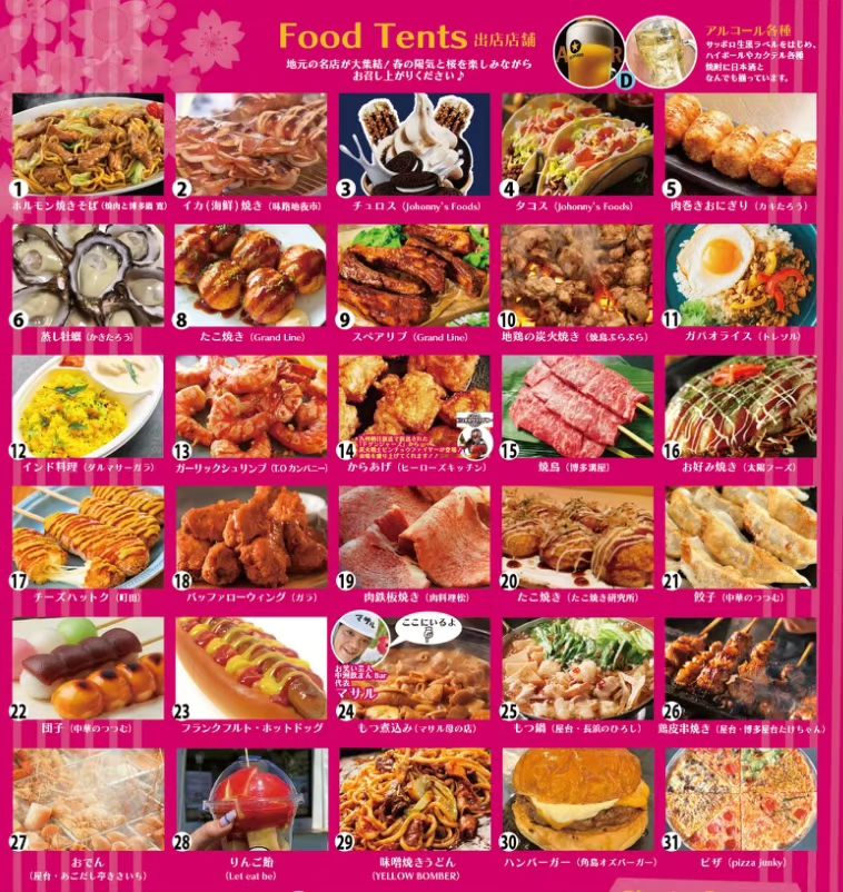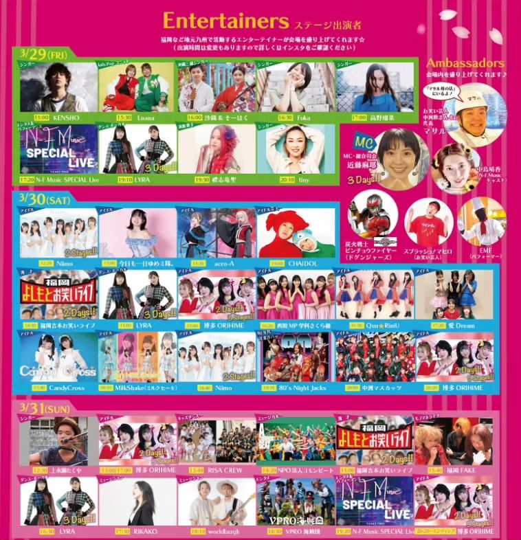 出店と出演は、地元の春グルメのフードテント(25店舗〜)、地元のアイドルグループやエンタメパフォーマー、福岡吉本お笑いライブやシンガー・アーチストの演奏、ベリーダンス、キッズチアなど。