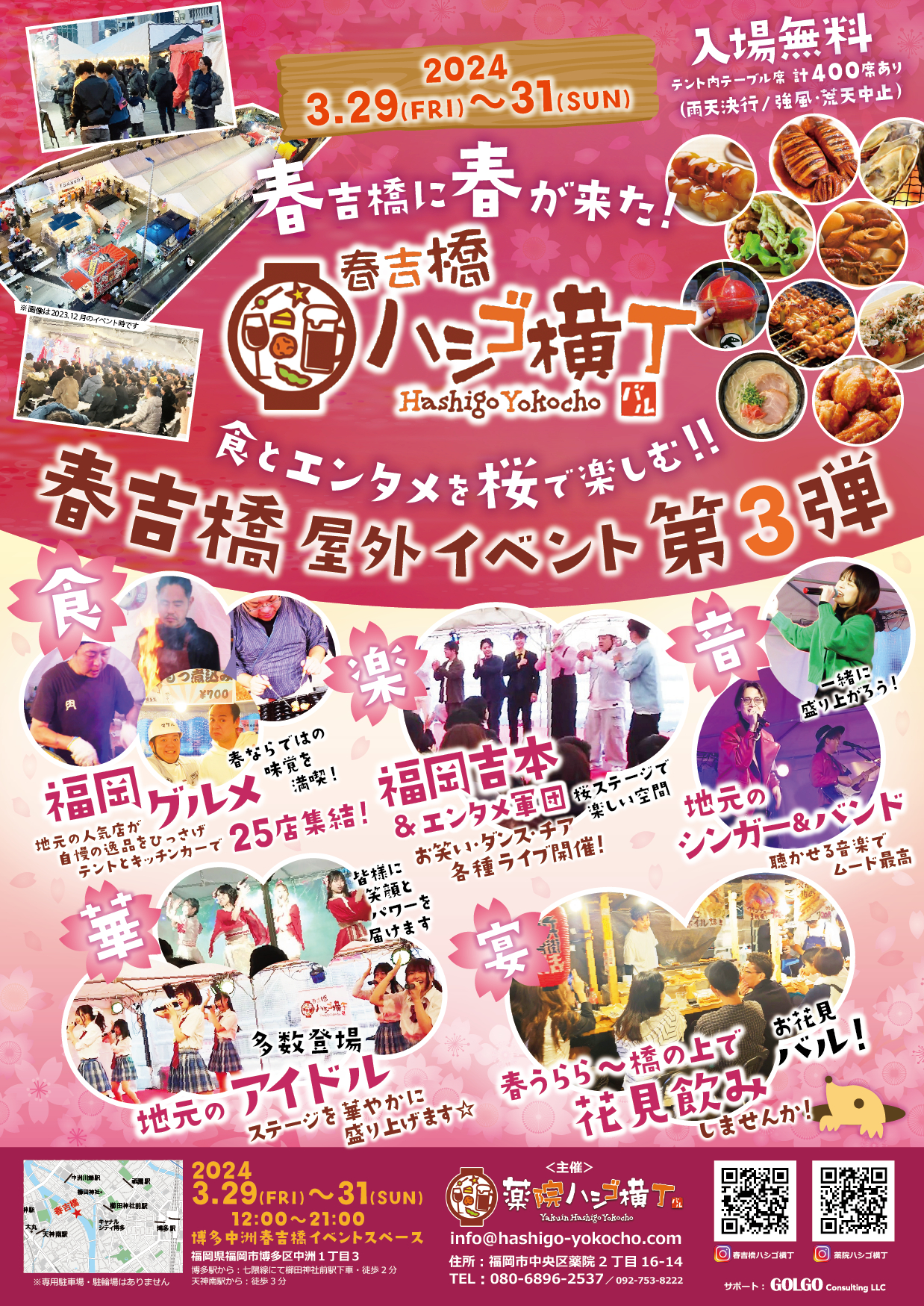 コロナ明けと呼べる2024年春、ここ数年出来なかった花見をあえて都会の中心部の春吉橋でできる、という斬新な企画で、老若男女の人達を集客しようという春吉橋初の試み。