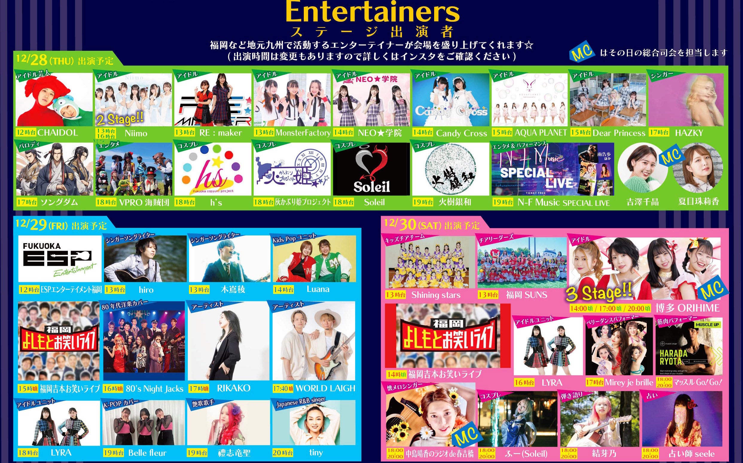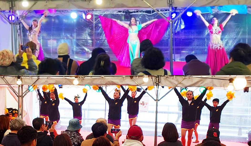 出店と出演:地元の冬グルメのフードテント(25店舗〜)、地元のアイドルグループやエンタメ パフォーマー、福岡吉本お笑いライブやシンガー・アーチストの演奏、ベリーダンス、キッズチアなど。