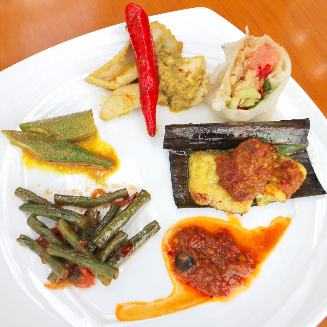 温製:カリケパライカンメラ(鯛のアラ煮付けカレー風味)、ルンダンルサ(鹿肉のスパイシー煮込みガランガル、レモングラス、ココナツミルク風味)、ウダンマサレマチリパディ(じっくり煮込んだ海老のスパイシーターメリック風味)、 パーシックアヤム(マレーシア風スパイシーローストチキン)、サテアヤム・ダジンクアカチャン(マレーシア風チキンとビーフのサティとピーナッツソース)、ウダンサンバル(車海老のチリペースト)、 ケルトゥクカンビン(タマリンド、クミン、コリアンダー、ローストスパイスのラムシャンク煮込み)、サユールゴレンジャワ(野菜と発酵豆、春雨のソテー)ほか