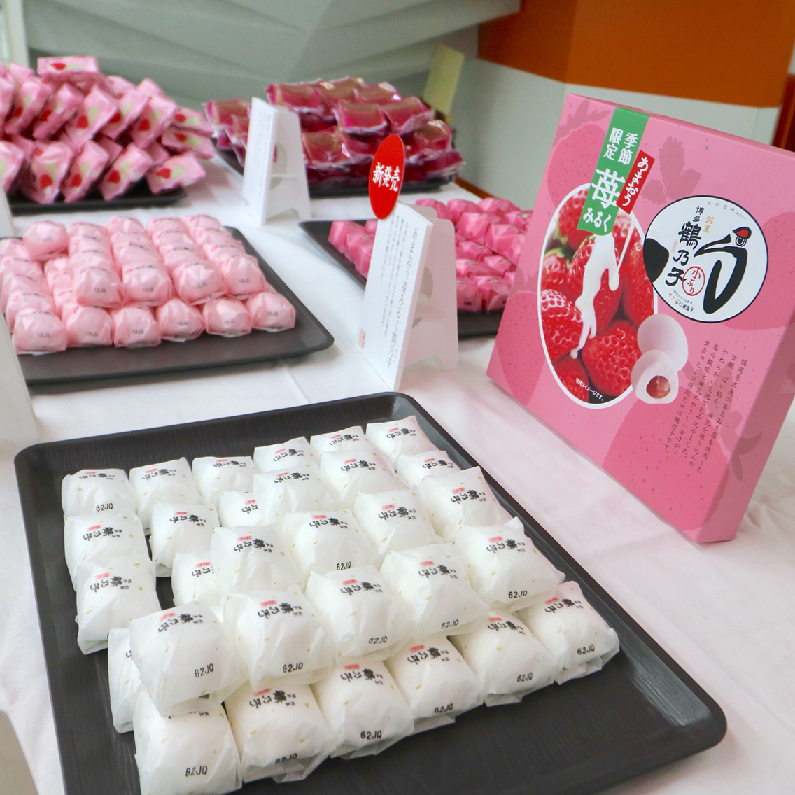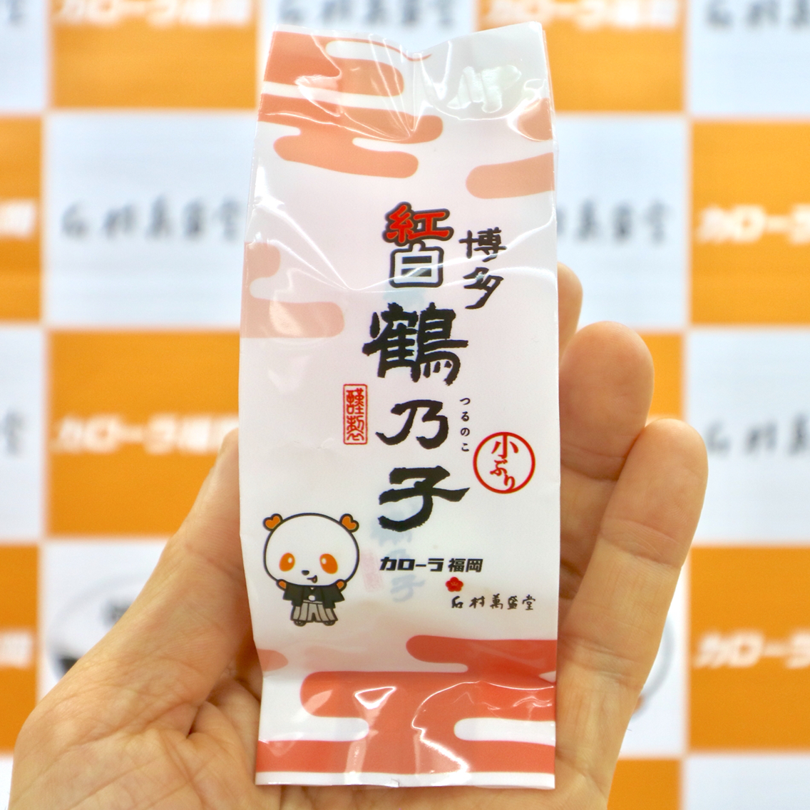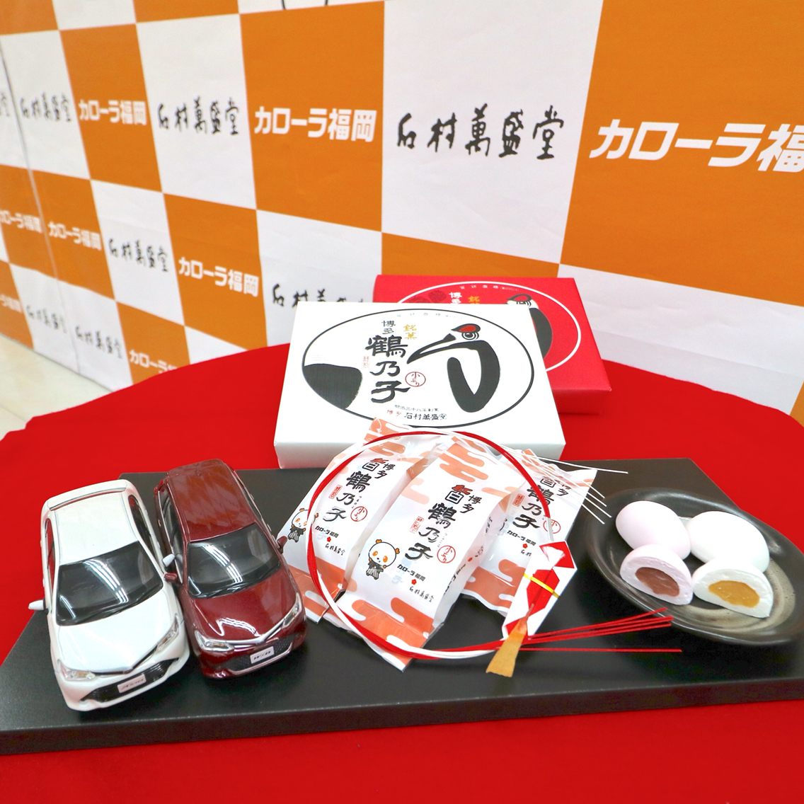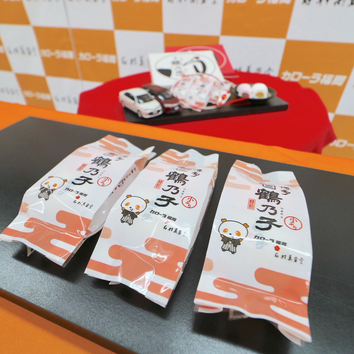 石村萬盛堂では、トヨタカローラ福岡の新春初売りに合わせて、トヨタカローラ福岡オリジナルの特製「紅白鶴乃子」を作成し、来場された方にお渡しするとの。