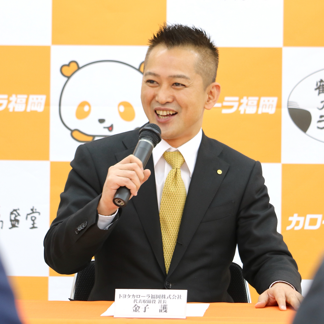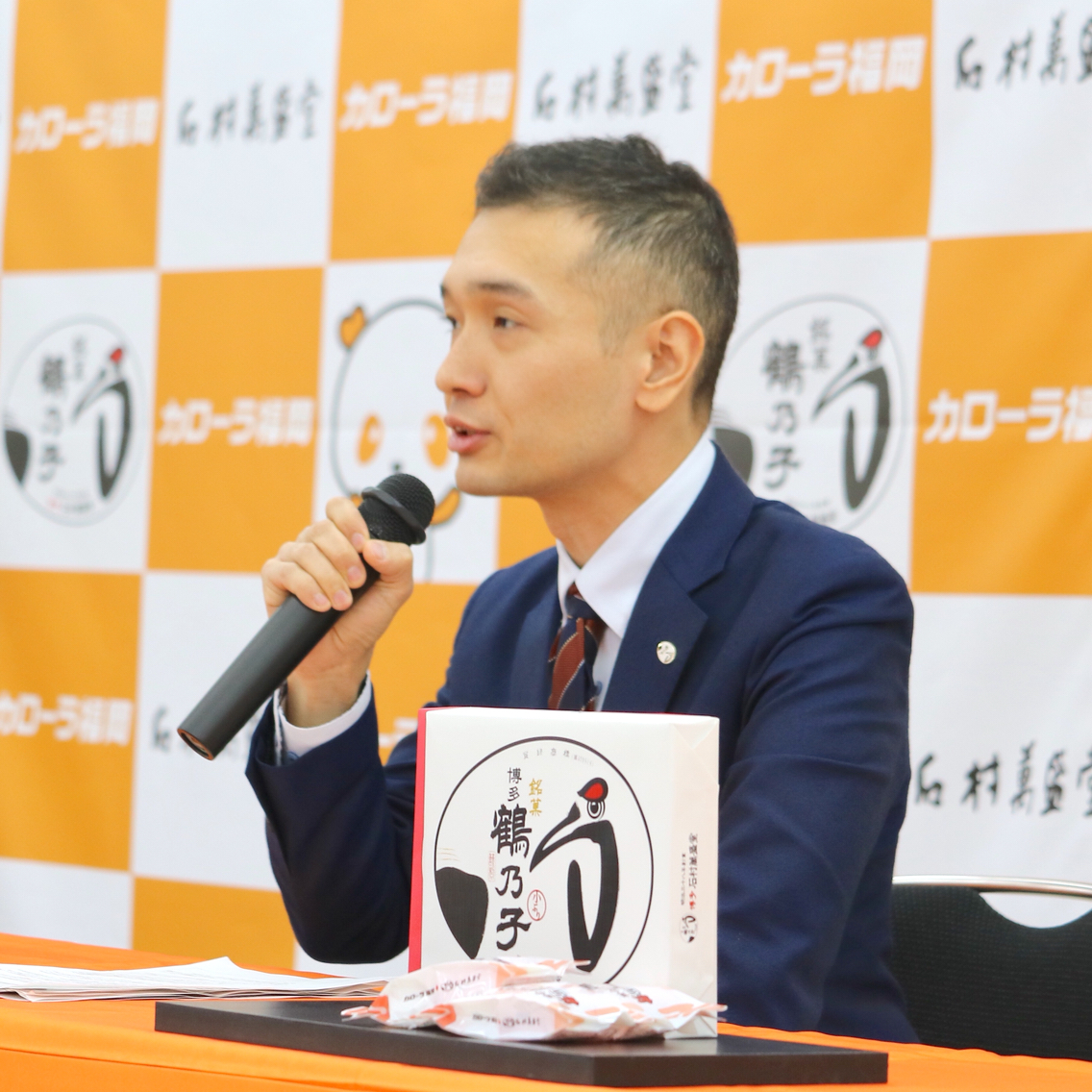 その開催に先立ち、石村萬盛堂の石村善之亮社長とトヨタカローラ福岡の金子護社長による記者会見が行われました。