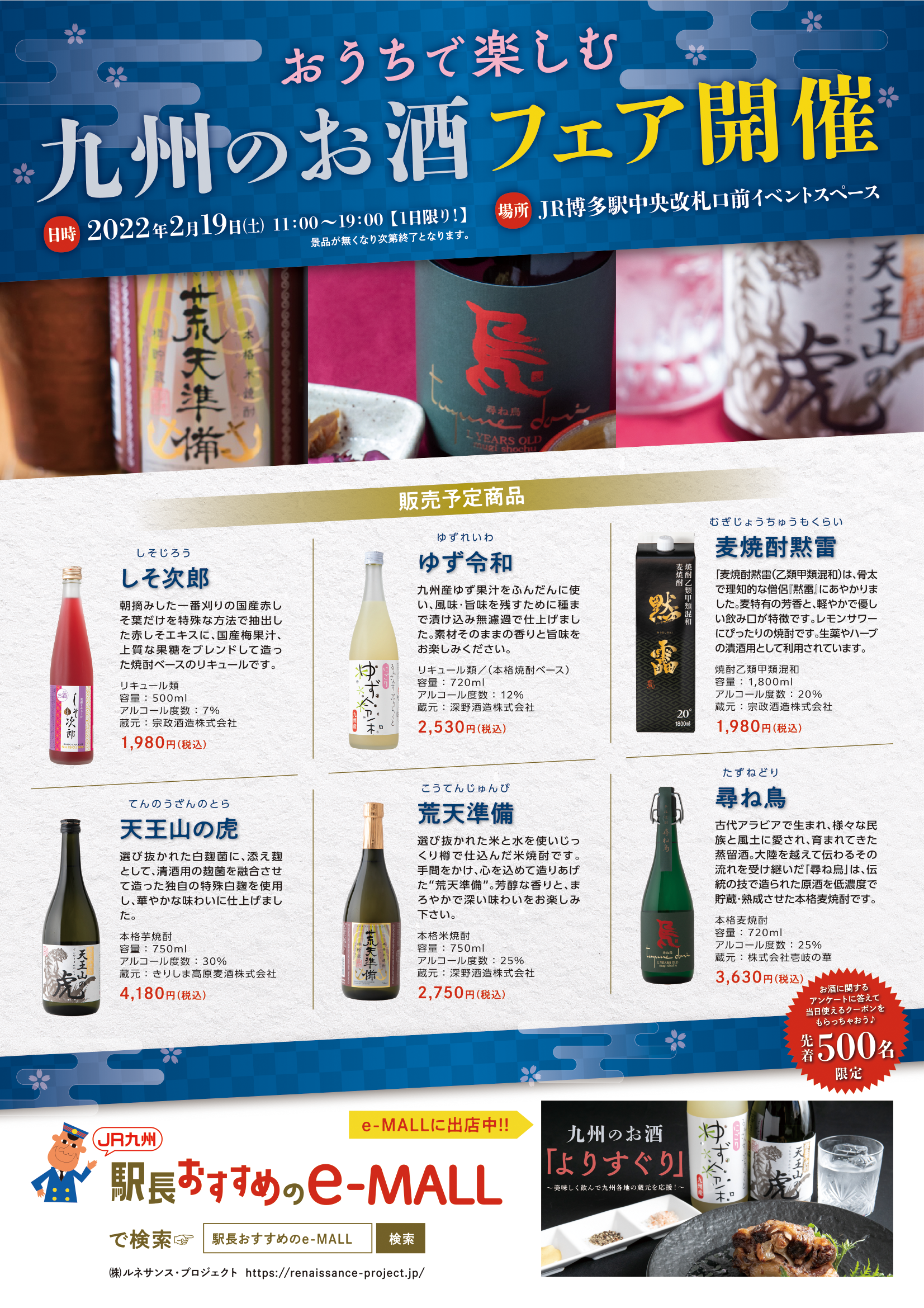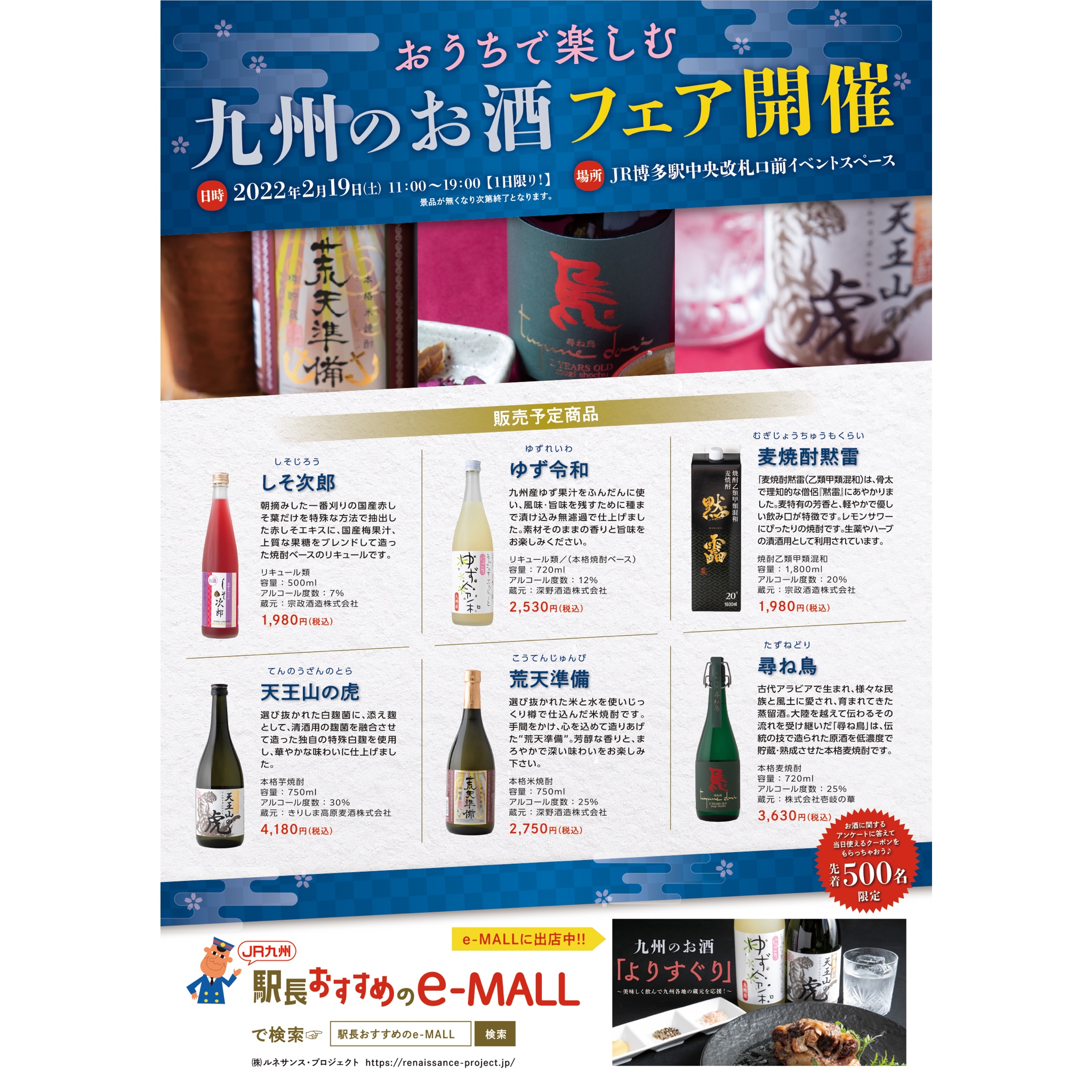2022年2月19日(土)11~19時、福岡市博多区博多駅中央街のJR博多駅中央改札口前イベントスペースで、「おうちで楽しむ 九州のお酒フェア」が開催されます。