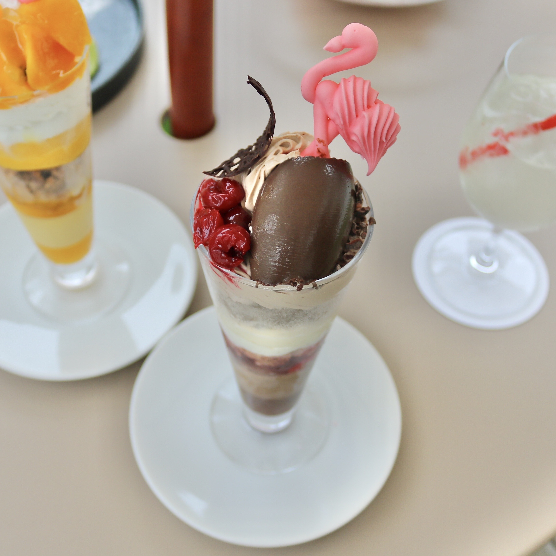 チョコレートをふんだんに使用し、赤ワインのジュレやクリオットのコンポートと合わせた贅沢なパフェ。